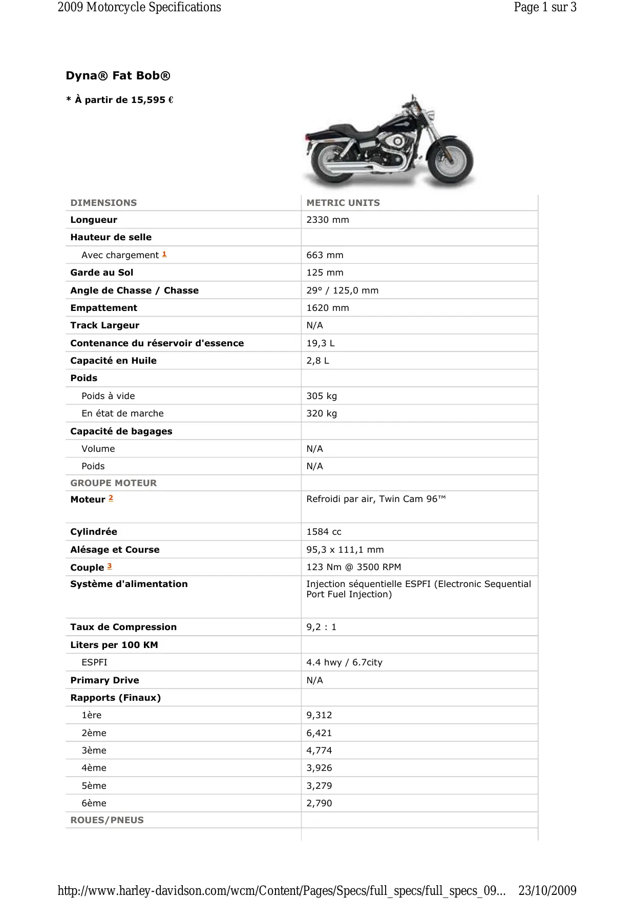 La disponibilité des coloris peut dépendre du concessionnaire et est modifiable sans préavis. Les informations de ce site reflètent la conception/fabrication des produits et des pièces à la date de leur diffusion. Le constructeur se réserve à tout moment le droit d’apporter des modifi cations à l’architecture, aux matériaux ou aux caractéristiques des composants de fabrication, à sa seule discrétion et sans avertissement préalable. Peuvent notamment être modifiés les composants de marque ou modèle différent. Certaines motos sont présentées avec des équipements en option. Nous nous réservons le droit d’améliorer en permanence les caractéristiques sans aucune obligation. Les caractéristiques détaillées sur ce site pourraient ne pas être conformes aux certifi cations offi cielles de certains marchés, selon la date de diffusion des informations du site, des differences dans les méthodes de test, et/ou des différences au niveau des véhicules. Les clients souhaitant prendre connaissance des spécifi cations réglementaires relatives à leur véhicule doivent se référer aux documents de certifi cation et/ou contacter leur concessionnaire ou distributeur agréé. Les visières de casque fumes utilisées sur les photos peuvent ne pas être autorisées à la vente ou à l’utilisation sur certains marchés. Certaines variations de couleur sont possibles suite aux limitations des procédés photographiques. Les caractéristiques des véhicules et accessoires peuvent varier d’un pays à l’autre en fonction des réglementations locales, certains modèles et accessoires ne sont pas disponibles dans tous les pays. N’oubliez pas que certains pays interdisent l’importation, l’immatriculation ou l’utilisation de véhicules et accessoires non conformes aux caractéristiques homologuées dans le pays. Le contrôle de certains systèmes et composants est à effectuer tous les 1600 km. © 2001-2009 H-D. Tous droits réservés. http://www.harley-davidson.com/wcm/Content/Pages/Specs/full_specs/full_specs_09... 23/10/2009