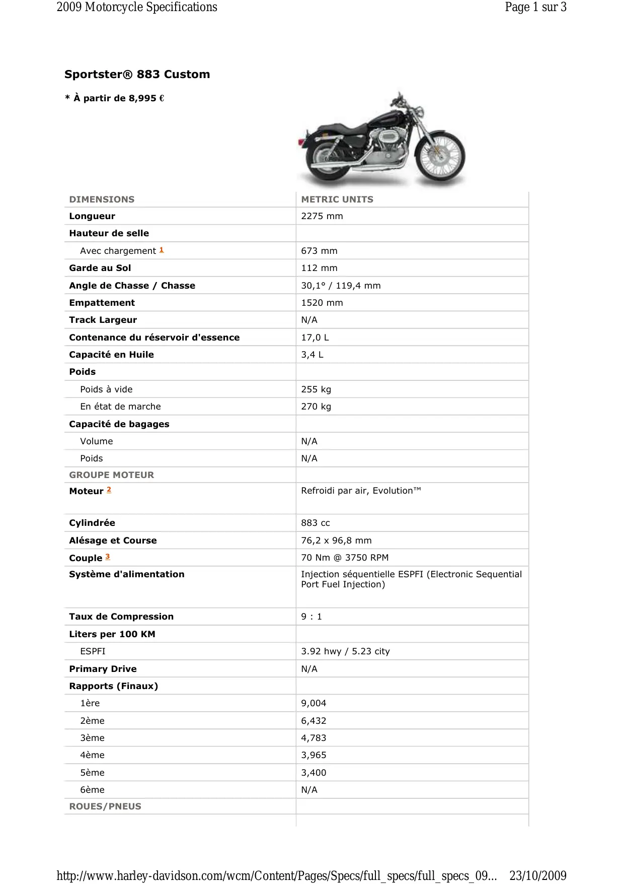La disponibilité des coloris peut dépendre du concessionnaire et est modifiable sans préavis. Les informations de ce site reflètent la conception/fabrication des produits et des pièces à la date de leur diffusion. Le constructeur se réserve à tout moment le droit d’apporter des modifi cations à l’architecture, aux matériaux ou aux caractéristiques des composants de fabrication, à sa seule discrétion et sans avertissement préalable. Peuvent notamment être modifiés les composants de marque ou modèle différent. Certaines motos sont présentées avec des équipements en option. Nous nous réservons le droit d’améliorer en permanence les caractéristiques sans aucune obligation. Les caractéristiques détaillées sur ce site pourraient ne pas être conformes aux certifi cations offi cielles de certains marchés, selon la date de diffusion des informations du site, des differences dans les méthodes de test, et/ou des différences au niveau des véhicules. Les clients souhaitant prendre connaissance des spécifi cations réglementaires relatives à leur véhicule doivent se référer aux documents de certifi cation et/ou contacter leur concessionnaire ou distributeur agréé. Les visières de casque fumes utilisées sur les photos peuvent ne pas être autorisées à la vente ou à l’utilisation sur certains marchés. Certaines variations de couleur sont possibles suite aux limitations des procédés photographiques. Les caractéristiques des véhicules et accessoires peuvent varier d’un pays à l’autre en fonction des réglementations locales, certains modèles et accessoires ne sont pas disponibles dans tous les pays. N’oubliez pas que certains pays interdisent l’importation, l’immatriculation ou l’utilisation de véhicules et accessoires non conformes aux caractéristiques homologuées dans le pays. Le contrôle de certains systèmes et composants est à effectuer tous les 1600 km. © 2001-2009 H-D. Tous droits réservés. http://www.harley-davidson.com/wcm/Content/Pages/Specs/full_specs/full_specs_09... 23/10/2009