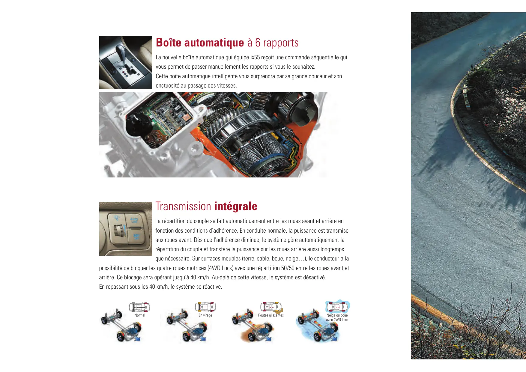 ix55 Suivez vos premières impressions Parfois les choses semblent être trop évidentes pour être vraies. Comme avec ix55. Design travaillé, équipements de haut niveau, puissance exceptionnelle et agilité étonnante, tout ceci ajouté à la qualité et au soin du détail Hyundai. Marche-pieds et bavettes indisponibles en France. Marche-pieds et bavettes indisponibles en France. Puissance (ch) Couple (Nm) tr/mn La puissance en art majeur ix55 reçoit un nouveau moteur à la pointe de la technologie. Ce moteur 6 cylindres CRDi 3.0L est équipé d’injecteurs Piézoélectriques qui fonctionnent à 1 600 bars. Ceci permet d’optimiser la consommation, de favoriser le couple et le temps de réponse. Ainsi, ce moteur qui dispose d’une puissance exceptionnelle de 239 ch (176 kW) offre également un couple de 450 N m de 1750 à 3500 tr/mn. La douceur et l’onctuosité du 6 cylindres vous raviront au quotidien. Marche-pieds et bavettes indisponibles en France. Boîte automatique à 6 rapports La nouvelle boîte automatique qui équipe ix55 reçoit une commande séquentielle qui vous permet de passer manuellement les rapports si vous le souhaitez. Cette boîte automatique intelligente vous surprendra par sa grande douceur et son onctuosité au passage des vitesses. Transmission intégrale La répartition du couple se fait automatiquement entre les roues avant et arrière en fonction des conditions d’adhérence. En conduite normale, la puissance est transmise aux roues avant. Dès que l'adhérence diminue, le système gère automatiquement la répartition du couple et transfère la puissance sur les roues arrière aussi longtemps que nécessaire. Sur surfaces meubles (terre, sable, boue, neige…), le conducteur a la possibilité de bloquer les quatre roues motrices (4WD Lock) avec une répartition 50/50 entre les roues avant et arrière. Ce blocage sera opérant jusqu'à 40 km/h. Au-delà de cette vitesse, le système est désactivé. En repassant sous les 40 km/h, le système se réactive. Normal En virage Routes glissantes Neige ou boue avec 4WD Lock Marche-pieds et bavettes indisponibles en France. Espace dédié au confort Regardez autour de vous et appréciez ce formidable espace de vie à bord. Les matériaux de grande qualité aux couleurs subtilement choisies côtoient les équipements de haut niveau. Au quotidien, les multiples rangements vous faciliteront la vie : console centrale avant ventilée avec bacs de rangements, grande boîte à gants verrouillable, prises 12V avant et arrière, rangement pour lunettes, porte-gobelets, poches aumônières et bien plus encore… Intérieur beige et décors façon bois indisponibles en France. Instrumentation bleutée Les compteurs et l’écran d’informations ne sont pas simplement bien positionnés, ils sont également extrêmement complets et agréables à regarder avec leur éclairage bleuté gage d’un confort visuel optimal par conduite nocturne. Système de gestion d’air conditionné ix55 reçoit un système de climatisation bi-zone qui gère automatiquement la régulation de la température souhaitée dans l’habitacle par le conducteur et le passager . Les passagers arrière peuvent également choisir indépendamment le débit et la température désirée. Sièges à réglages multiples Le siège conducteur possède 5 réglages électriques, hauteur et inclinaison de l’assise, profondeur , inclinaison et support lombaire. Intérieur beige et décors façon bois indisponibles en France. Un incroyable espace de vie ix55 possède un habitacle exceptionnellement vaste et généreux. Disponible de série en sept places, vous bénéficierez à chaque place d’un espace de voyage extrêmement confortable. Intérieur beige et décors façon bois indisponibles en France. Marche-pieds et bavettes indisponibles en France. Intérieur beige et décors façon bois indisponibles en France.