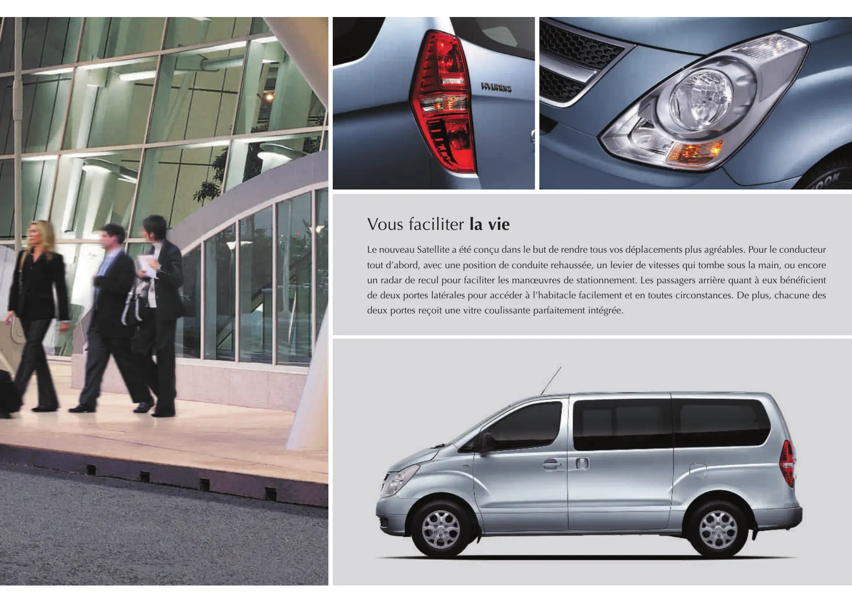 Avec le nouveau Satellite, la praticité ne rime plus avec morosité. S'appuyant sur un design moderne, le nouveau Satellite innove par l'attention portée au dessin de chaque élément de sa carrosserie. Que ce soient ses passages de roues galbés ou sa face avant proéminente, c'est l'ensemble de ces lignes puissamment sculptées qui donne au nouveau Satellite une assurance déconcertanteigne des plus grands athletes. Un sentiment par ailleurs justifié lorsqu'il s'agit de détailler quelques uns de ses attributs : deux portes laterales coulissantes pour acceder aux places arrière, huit places réparties sur trois rangées, une motorisation CRDi 170 ch., ou encore un correcteur électronique de trajectorie ESP.
