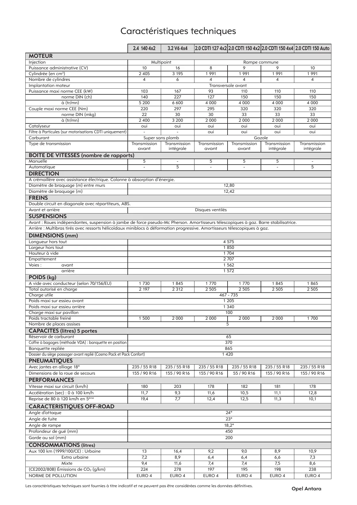 110 / 150 Fiche Technique Opel Antara (Châssis 10 / 2010A) Caractéristiques techniques