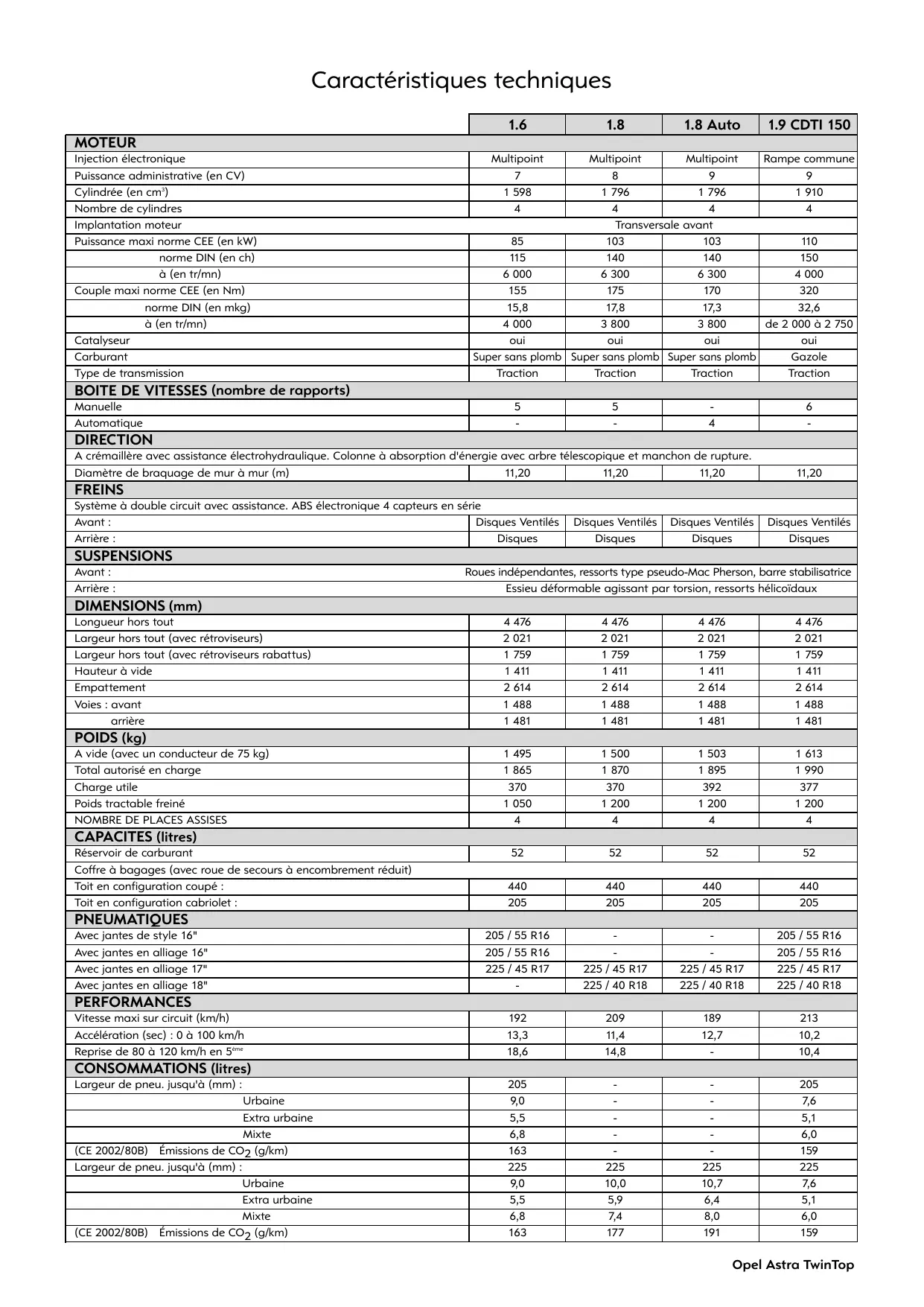 Fiche Technique ASTRA TwinTop (Châssis 10 / 2010B) Caractéristiques techniques