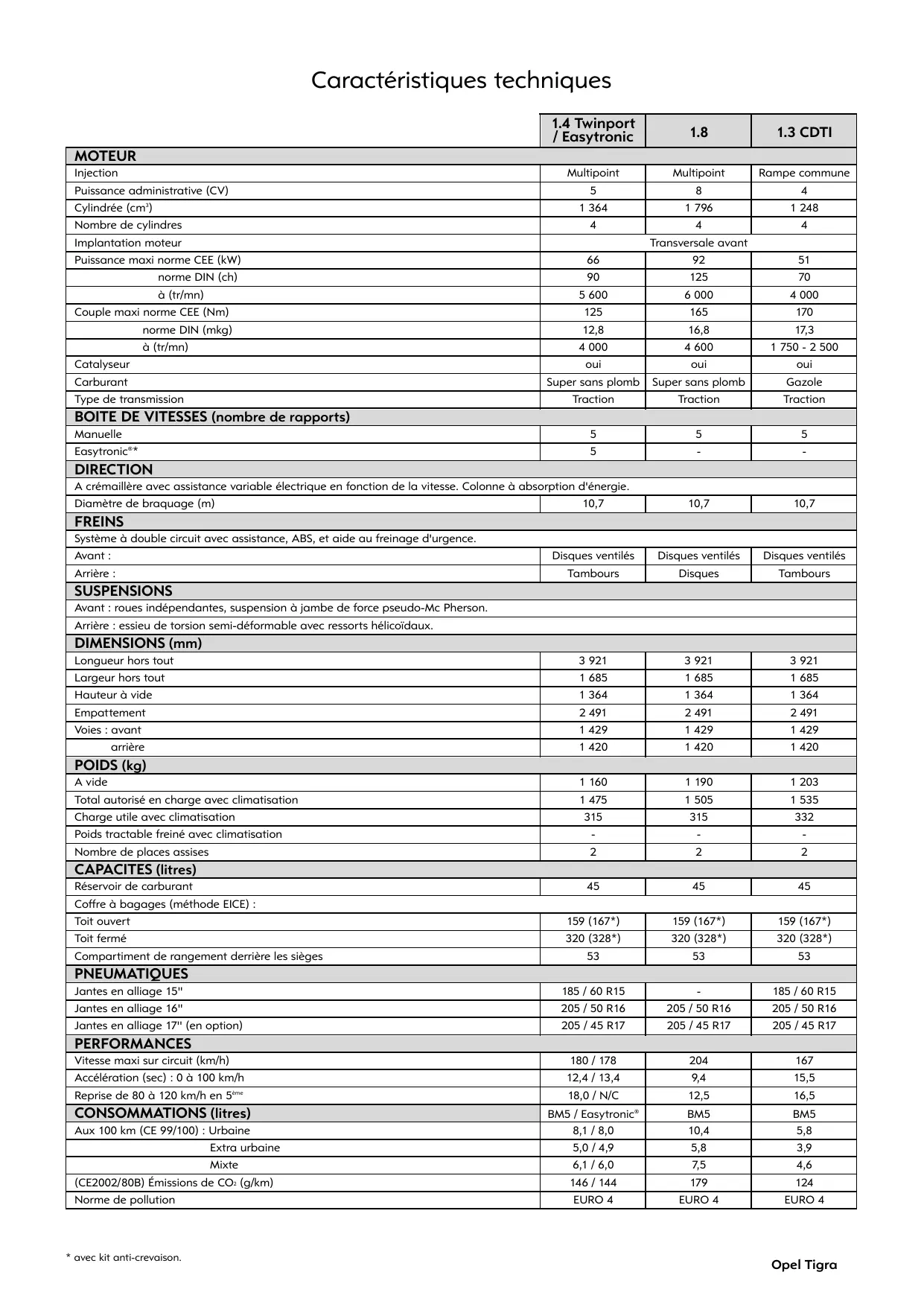 • Marque déposée. Coussins gonflables de sécurité. Opel Tigra Construction de gamme Enjoy Sport Linea Rossa RedTop Revêtement de toit en toile bordeaux Peinture métallisée Peinture métallisée Sellerie mixte Oxygène / Morrocana Sellerie cuir Mondial rouge carmin Sellerie cuir Mondial anthracite Phares antibrouillard AV intégrés Phares antibrouillard AV intégrés Phares antibrouillard AV intégrés Entourage des feux avant blanc Entourage des feux avant noir avec inserts chromés Entourage des feux avant noir avec inserts chromés Entourage des feux avant noir avec inserts chromés Jantes en alliage léger 15'' à 8 branches Jantes en alliage léger 16'' à 11 branches Jantes en alliage léger 17'' à 5 branches Jantes en alliage léger 17'' à 5 branches Régulateur de vitesse Régulateur de vitesse Régulateur de vitesse Filet à bagages pour rangement derrière les sièges Filet à bagages pour rangement derrière les sièges Filet à bagages pour rangement derrière les sièges Pédalier en alliage perforé (indisponible sur Easytronic®) Pédalier en alliage perforé (indisponible sur Easytronic®) Pédalier en alliage perforé (indisponible sur Easytronic®) Volant sport gainé cuir Volant sport gainé cuir Volant sport gainé cuir Volant réglable en hauteur Volant réglable en hauteur Volant réglable en hauteur Volant réglable en hauteur Radio CD30 MP3 et prise auxiliaire audio Radio CD30 MP3, volant multifonction et prise auxiliaire audio Radio CD30 MP3, volant multifonction et prise auxiliaire audio Radio CD30 MP3, volant multifonction et prise auxiliaire audio Vitres électriques à impulsion Vitres électriques à impulsion Vitres électriques à impulsion Vitres électriques à impulsion Climatisation manuelle Climatisation manuelle Climatisation manuelle Climatisation manuelle Direction électrique à assistance variable (EPS) Direction électrique à assistance variable (EPS) Direction électrique à assistance variable (EPS) Direction électrique à assistance variable (EPS) Rétroviseurs extérieurs, asphérique côté conducteur, dégivrants à réglage électrique Rétroviseurs extérieurs, asphérique côté conducteur, dégivrants à réglage électrique Rétroviseurs extérieurs, asphérique côté conducteur, dégivrants à réglage électrique Rétroviseurs extérieurs, asphérique côté conducteur, dégivrants à réglage électrique Soufflet de levier de vitesses et du frein à main, et contreportes vinyl rouge carmin Tapis de sol spécifiques Tapis de sol spécifiques Ceintures de sécurité avec prétensionneurs à déclenchement pyrotechnique et limiteur d'effort Ceintures de sécurité avec prétensionneurs à déclenchement pyrotechnique et limiteur d'effort Ceintures de sécurité couleur argent avec prétensionneurs à déclenchement pyrotechnique et limiteur d'effort Ceintures de sécurité couleur noire avec prétensionneurs à déclenchement pyrotechnique et limiteur d'effort Système de pédalier rétractable en cas de choc frontal (PRS) Système de pédalier rétractable en cas de choc frontal (PRS) Système de pédalier rétractable en cas de choc frontal (PRS) Système de pédalier rétractable en cas de choc frontal (PRS) Système antiblocage des roues (ABS) et répartiteur électronique de freinage (EBD) Système antiblocage des roues (ABS) et répartiteur électronique de freinage (EBD) Système antiblocage des roues (ABS) et répartiteur électronique de freinage (EBD) Système antiblocage des roues (ABS) et répartiteur électronique de freinage (EBD) 4 Airbags Opel* 4 Airbags Opel* 4 Airbags Opel* 4 Airbags Opel* Opel Tigra Profitez des Services Opel Opel vous propose ce que nous pensons être le meilleur et le plus complet des programmes de service existants. Ce programme débute dès le tout premier jour. Votre véhicule est couvert par une garantie véhicule neuf de 24 mois, kilométrage illimité, une garantie anticorrosion de 12 ans et une garantie sur les pièces de rechange et accessoires Opel d’origine de 2 ans. SERVICE APRÈS-VENTE DANS TOUTE L’EUROPE Partout en Europe, plus de 6 000 ateliers de réparation Opel spécialisés sont prêts à vous assurer un service après-vente professionnel et ponctuel. Bien sûr votre véhicule bénéficiera des plus hauts critères de réparation et plus encore, vous saurez exactement ce qui a été effectué et pourquoi, et ce que tous les coûts recouvrent.
