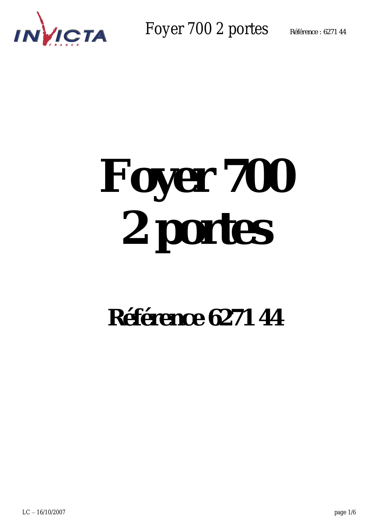 Foyer 700 2 portes Référence : 6271 44 Foyer 700 2 portes Référence 6271 44 LC – 16/10/2007 page 1/6 Foyer 700 2 portes Référence : 6271 44 Notice particulière d’utilisation et d’installation Consulter attentivement ce complément notice particulière ainsi que la notice générale également livrée avec l’appareil. Caractéristiques suivant EN 13229 : 14 kW 74 %