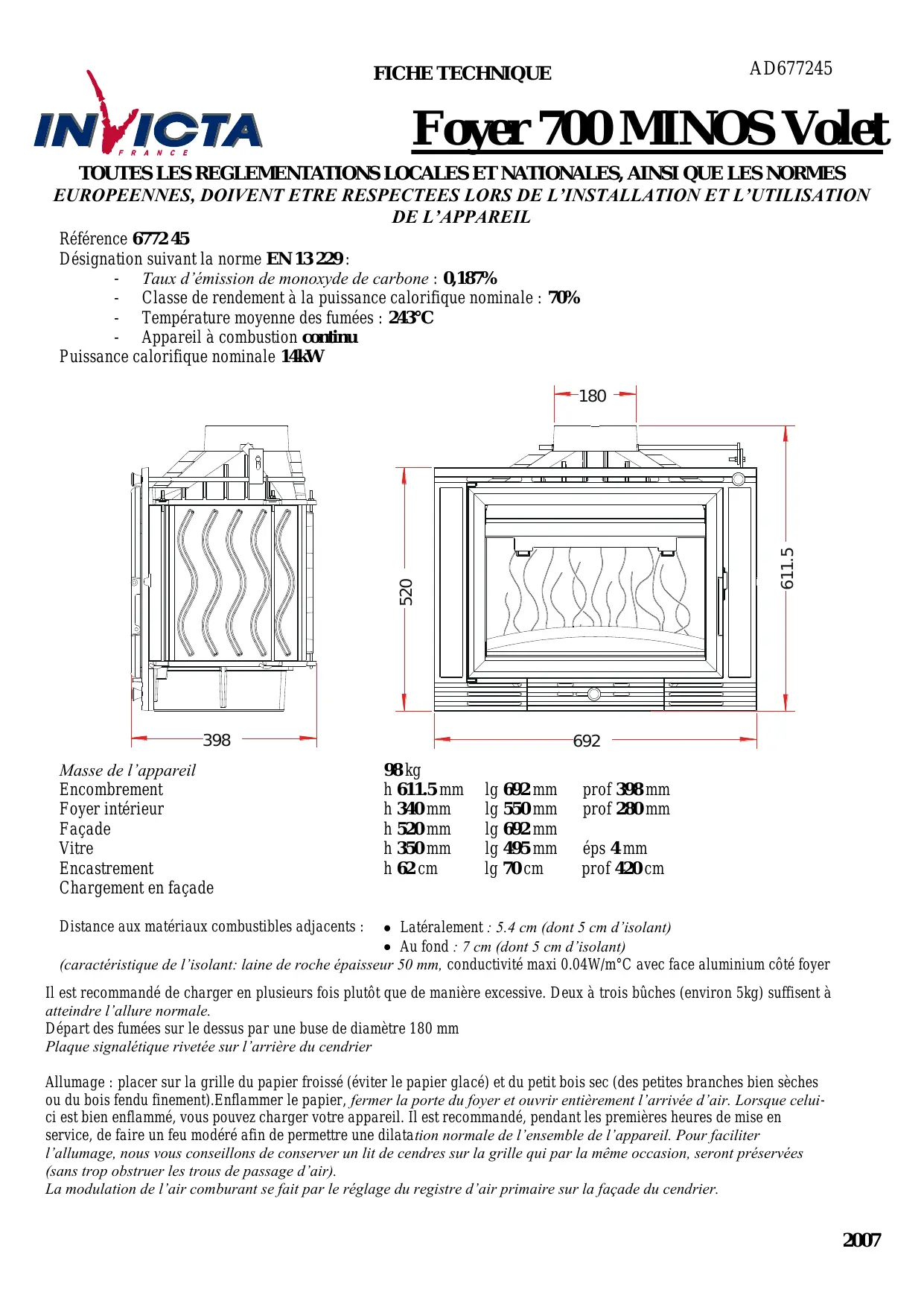 98 kg h 611.5 mm h 340 mm h 520 mm h 350 mm h 62 cm lg 692 mm lg 550 mm lg 692 mm lg 495 mm lg 70 cm prof 398 mm prof 280 mm éps 4 mm prof 420 cm Latéralement : 5.4 cm (dont 5 cm d’isolant) Au fond : 7 cm (dont 5 cm d’isolant) (caractéristique de l’isolant: laine de roche épaisseur 50 mm, conductivité maxi 0.04W/m°C avec face aluminium côté foyer Distance aux matériaux combustibles adjacents : Il est recommandé de charger en plusieurs fois plutôt que de manière excessive. Deux à trois bûches (environ 5kg) suffisent à atteindre l’allure normale. Départ des fumées sur le dessus par une buse de diamètre 180 mm Plaque signalétique rivetée sur l’arrière du cendrier Allumage : placer sur la grille du papier froissé (éviter le papier glacé) et du petit bois sec (des petites branches bien sèches ou du bois fendu finement).Enflammer le papier, fermer la porte du foyer et ouvrir entièrement l’arrivée d’air. Lorsque celuici est bien enflammé, vous pouvez charger votre appareil. Il est recommandé, pendant les premières heures de mise en service, de faire un feu modéré afin de permettre une dilatation normale de l’ensemble de l’appareil. Pour faciliter l’allumage, nous vous conseillons de conserver un lit de cendres sur la grille qui par la même occasion, seront préservées (sans trop obstruer les trous de passage d’air). La modulation de l’air comburant se fait par le réglage du registre d’air primaire sur la façade du cendrier. Octobre 2007 AD677245 FICHE TECHNIQUE Foyer 700 MINOS Volet