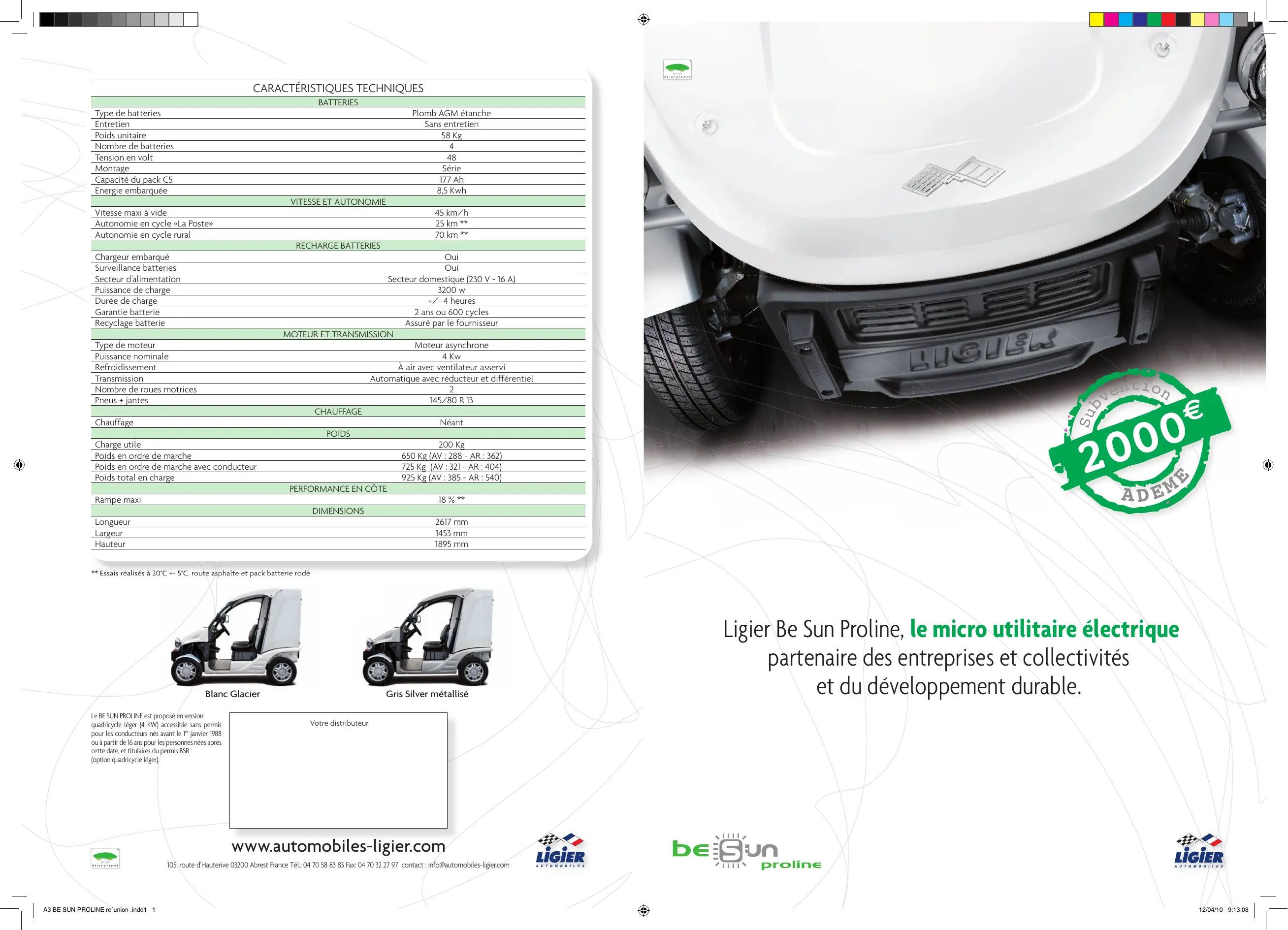 18 % ** DIMENSIONS 2617 mm 1453 mm 1895 mm Su b Chargeur embarqué Surveillance batteries Secteur d’alimentation Puissance de charge Durée de charge Garantie batterie Recyclage batterie ** Essais réalisés à 20°C +- 5°C, route asphalte et pack batterie rodé Blanc Glacier Le BE SUN PROLINE est proposé en version quadricycle léger (4 KW) accessible sans permis pour les conducteurs nés avant le 1er janvier 1988 ou à partir de 16 ans pour les personnes nées après cette date, et titulaires du permis BSR (option quadricycle léger). Gris Silver métallisé Ligier Be Sun Proline, le micro utilitaire électrique partenaire des entreprises et collectivités et du développement durable. Votre distributeur www.automobiles-ligier.com 105, route d’Hauterive 03200 Abrest France Tél.: 04 70 58 83 83 Fax: 04 70 32 27 97 contact : info@automobiles-ligier.com A3 BE SUN PROLINE réunion .indd1 1 12/04/10 9:13:08 Consommation pour 100 km Tarif EDF heures creuses au 1er janvier 2010 Su b nt ion