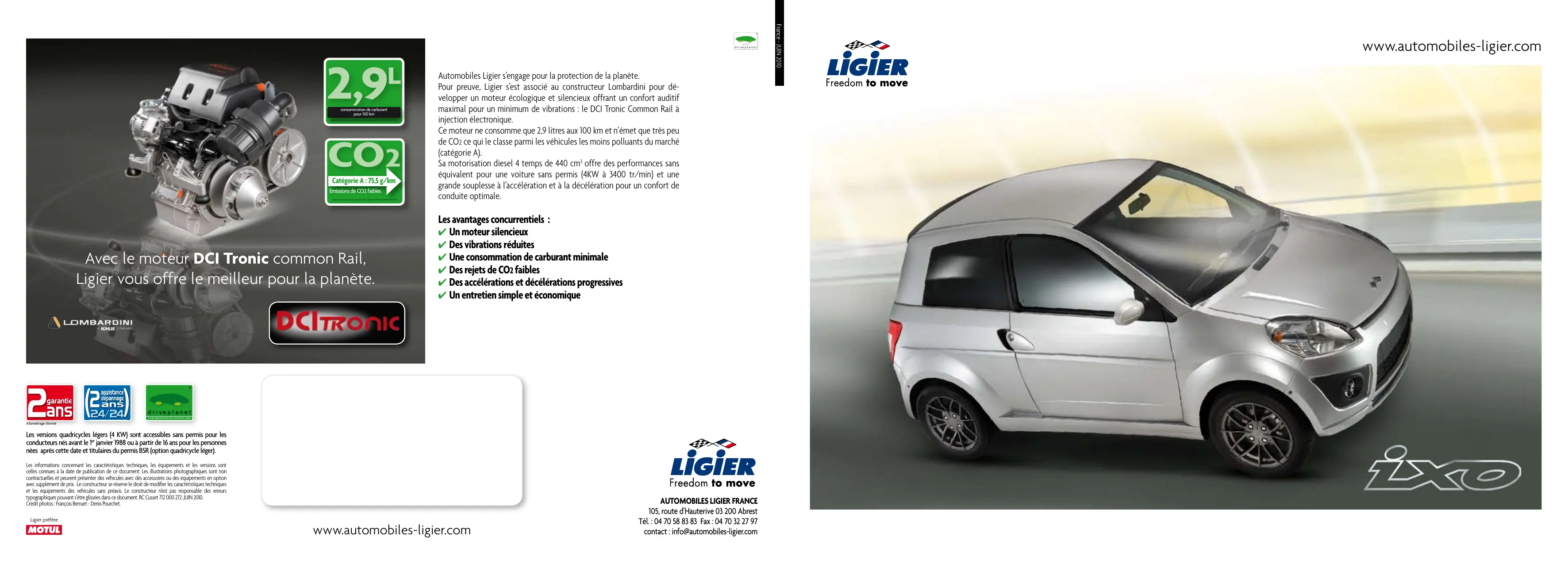 France - JUIN 2010 consommation de carburant pour 100 km Mesures effectuées suivant le cycle décrit dans la directive 97/24CE modifiée 2006/120/CE. Catégorie A : 75,5 g/km Emissions de CO2 faibles Mesures effectuées suivant le cycle décrit dans la directive 97/24CE modifiée 2006/120/CE. Avec le moteur DCI Tronic common Rail, Ligier vous offre le meilleur pour la planète. Automobiles Ligier s’engage pour la protection de la planète. Pour preuve, Ligier s’est associé au constructeur Lombardini pour développer un moteur écologique et silencieux offrant un confort auditif maximal pour un minimum de vibrations : le DCI Tronic Common Rail à injection électronique. Ce moteur ne consomme que 2,9 litres aux 100 km et n’émet que très peu de CO2 ce qui le classe parmi les véhicules les moins polluants du marché (catégorie A). Sa motorisation diesel 4 temps de 440 cm3 offre des performances sans équivalent pour une voiture sans permis (4KW à 3400 tr/min) et une grande souplesse à l’accélération et à la décélération pour un confort de conduite optimale. Les avantages concurrentiels : 4 Un moteur silencieux 4 Des vibrations réduites 4 Une consommation de carburant minimale 4 Des rejets de CO2 faibles 4 Des accélérations et décélérations progressives 4 Un entretien simple et économique Kilométrage illimité Les versions quadricycles légers (4 KW) sont accessibles sans permis pour les conducteurs nés avant le 1er janvier 1988 ou à partir de 16 ans pour les personnes nées après cette date et titulaires du permis BSR (option quadricycle léger). Les informations concernant les caractéristiques techniques, les équipements et les versions sont celles connues à la date de publication de ce document. Les illustrations photographiques sont non contractuelles et peuvent présenter des véhicules avec des accessoires ou des équipements en option avec supplément de prix. Le constructeur se réserve le droit de modifier les caractéristiques techniques et les équipements des véhicules sans préavis. Le constructeur n’est pas responsable des erreurs typographiques pouvant s’être glissées dans ce document. RC Cusset 712 000 272. JUIN 2010. Crédit photos : François Berruet - Denis Pourchet. Ligier préfère www.automobiles-ligier.com