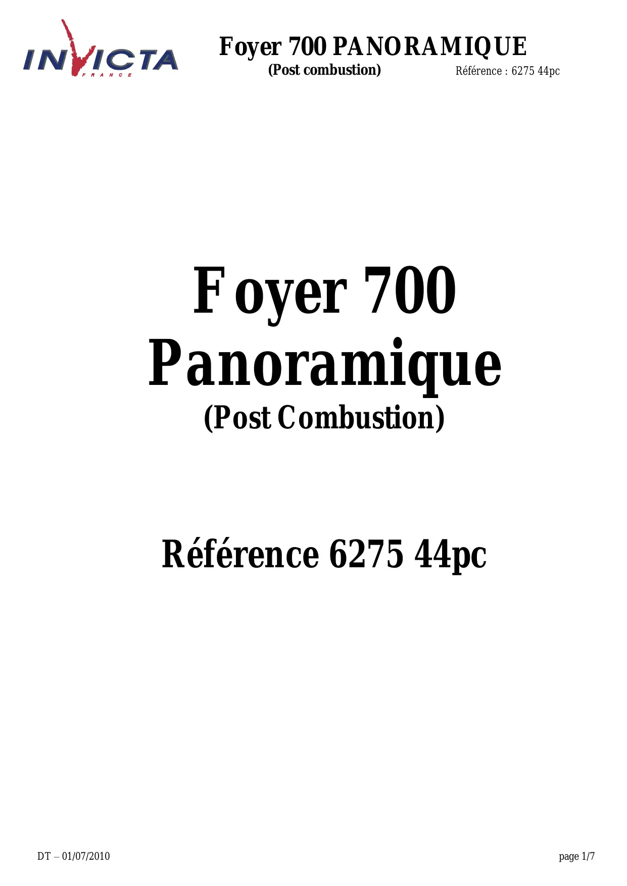 Ecrou embase AV7220060 DT – 01/07/2010 page 5/7 Foyer 700 PANORAMIQUE (Post combustion) Référence : 6275 44pc TRES IMPORTANT En complément de ce document, consulter attentivement la « NOTICE D’INSTALLATION ET D’UTILISATION POUR FOYER ET INSERTS » fournie avec l’appareil.