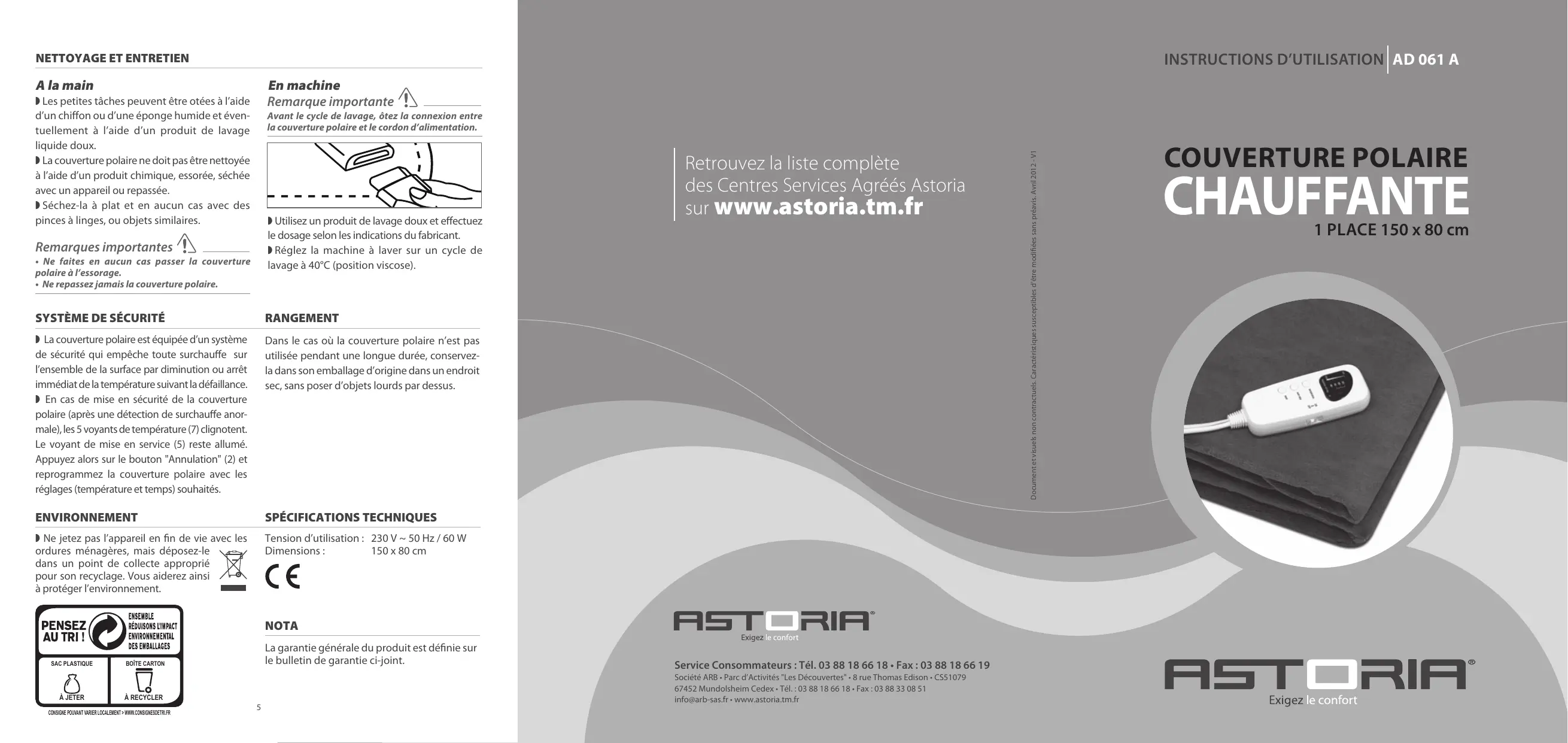 - Ne repassez jamais la couverture polaire. Retrouvez la liste complète des Centres Services Agréés Astoria sur www.astoria.tm.fr NOTA SAC PLASTIQUE À JETER La garantie générale du produit est définie sur le bulletin de garantie ci-joint.