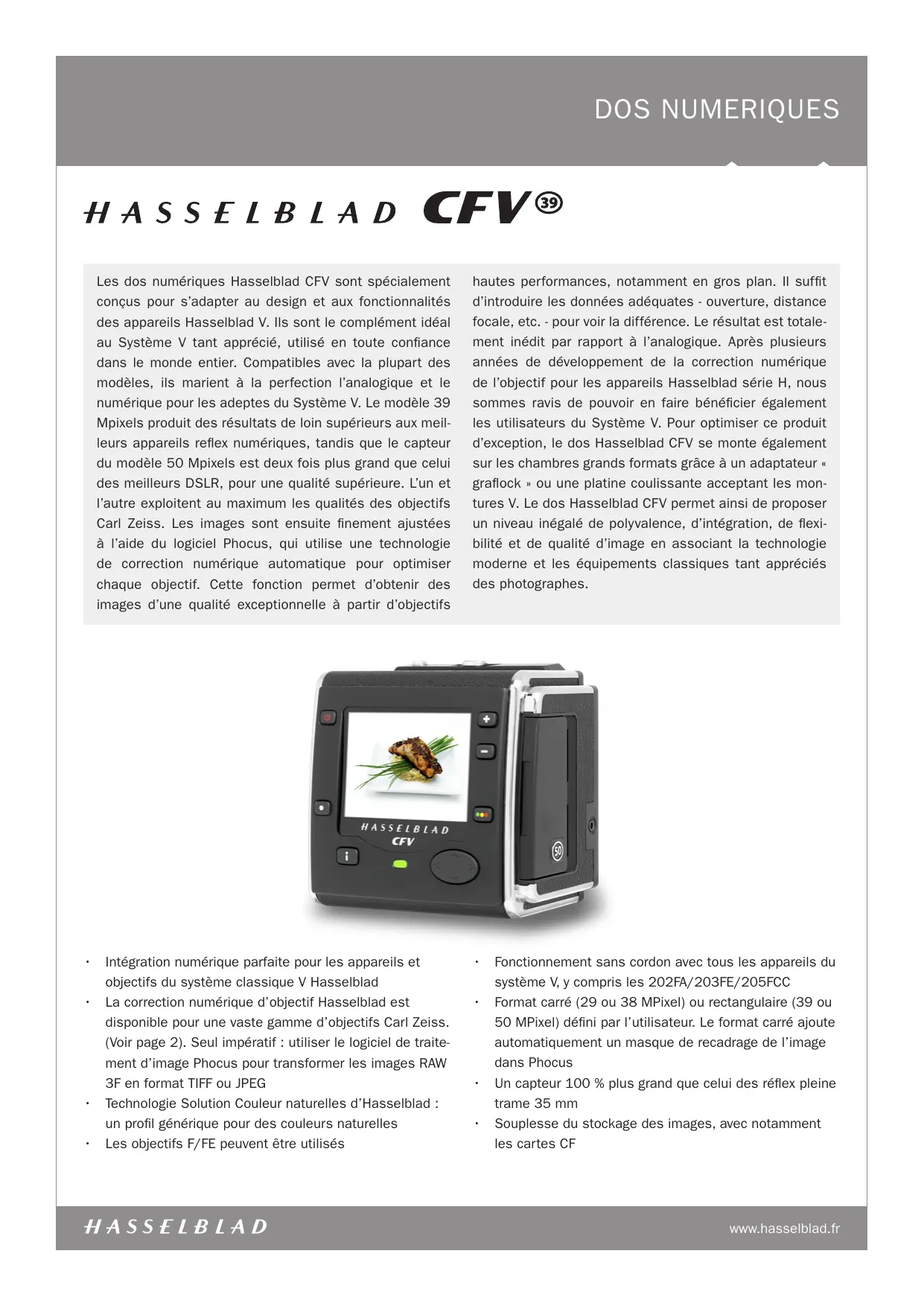 Les dos numériques Hasselblad CFV sont spécialément concus pour s'adapter au design et aux fonctionnalités des apparciels Hasselblad V. Ils sont le complément idéal au Système V tant apprécié, utilisé en toute confiance dans le monde entier. Compatibleles avec la plupart des modèles, ils mariant à la perfection l'analogue et le numérique pour les adeptes du Système V. Le modele 39 Mpixels produit des résultats de loin supérieurs aux mêleurs apparciels reflex numériques, tandis que le capteur du modele 50 Mpixels est deux fois plus grand que celui des mêleurs DSLR, pour une qualité supérieure. L'un et l'autre exploit au maximum les qualités des objectifs Carl Zeiss. Les images sont ensuite finiment ajustées à l'aide du logiciel Phocus, qui utilise une technologie de correction numérique automatique pour optimiser chaque objectif. Cette fonction permet d'obtenir des images d'une qualité exceptionnelle à partir d'objectifs