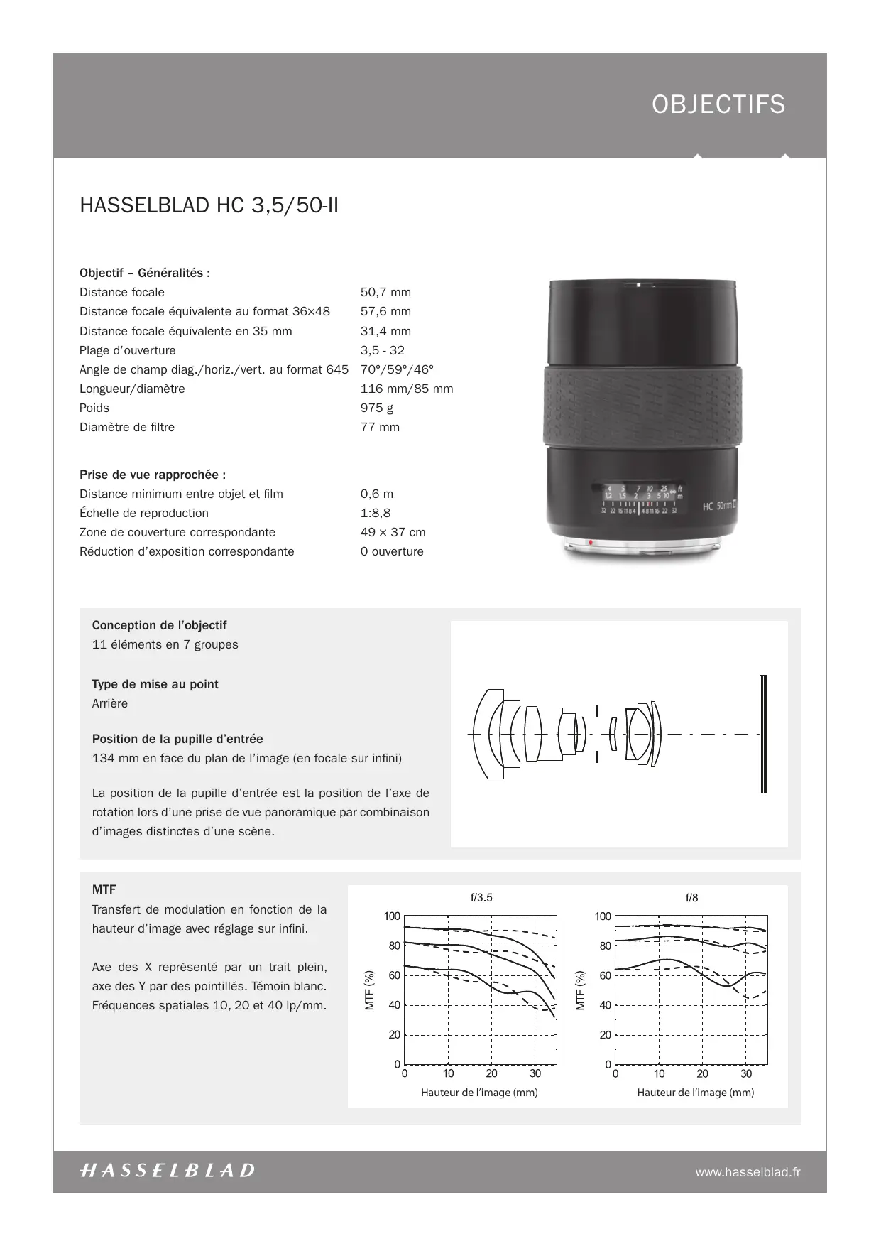 | Caractéristiques techniques principales | Objectif Hasselblad HC 3.5-50-II |