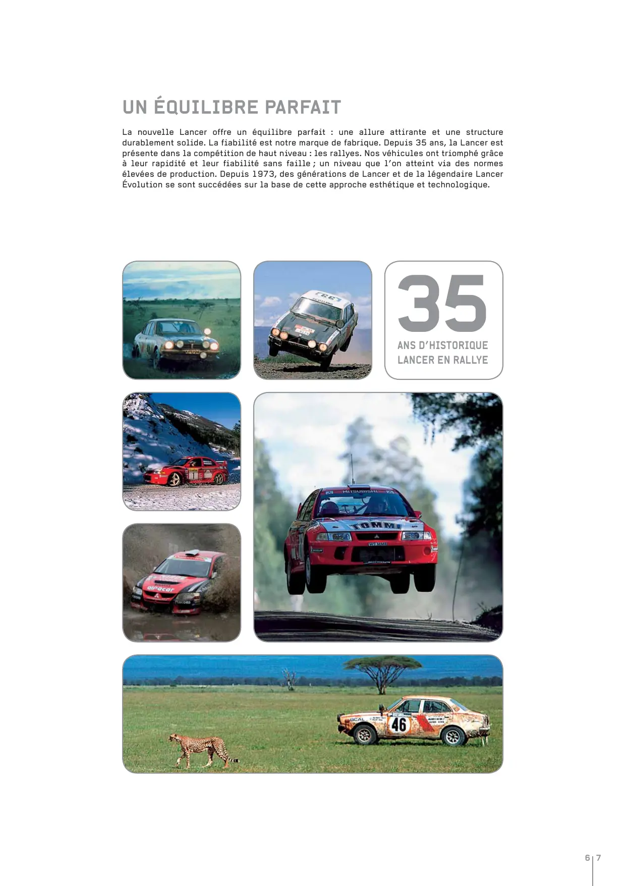 La nouvelle Lancer offre un équilibre parfait : une allure attirante et une structure durablement solide. La fiabilité est notre marque de fabrique. Depuis 35 ans, la Lancer est présente dans la compétition de haut niveau : les rallyes. Nos véhicules ont triomphé grâce à leur rapidité et leur fiabilité sans faille ; un niveau que l’on atteint via des normes élevées de production. Depuis 1973, des générations de Lancer et de la légendaire Lancer Évolution se sont succédées sur la base de cette approche esthétique et technologique.