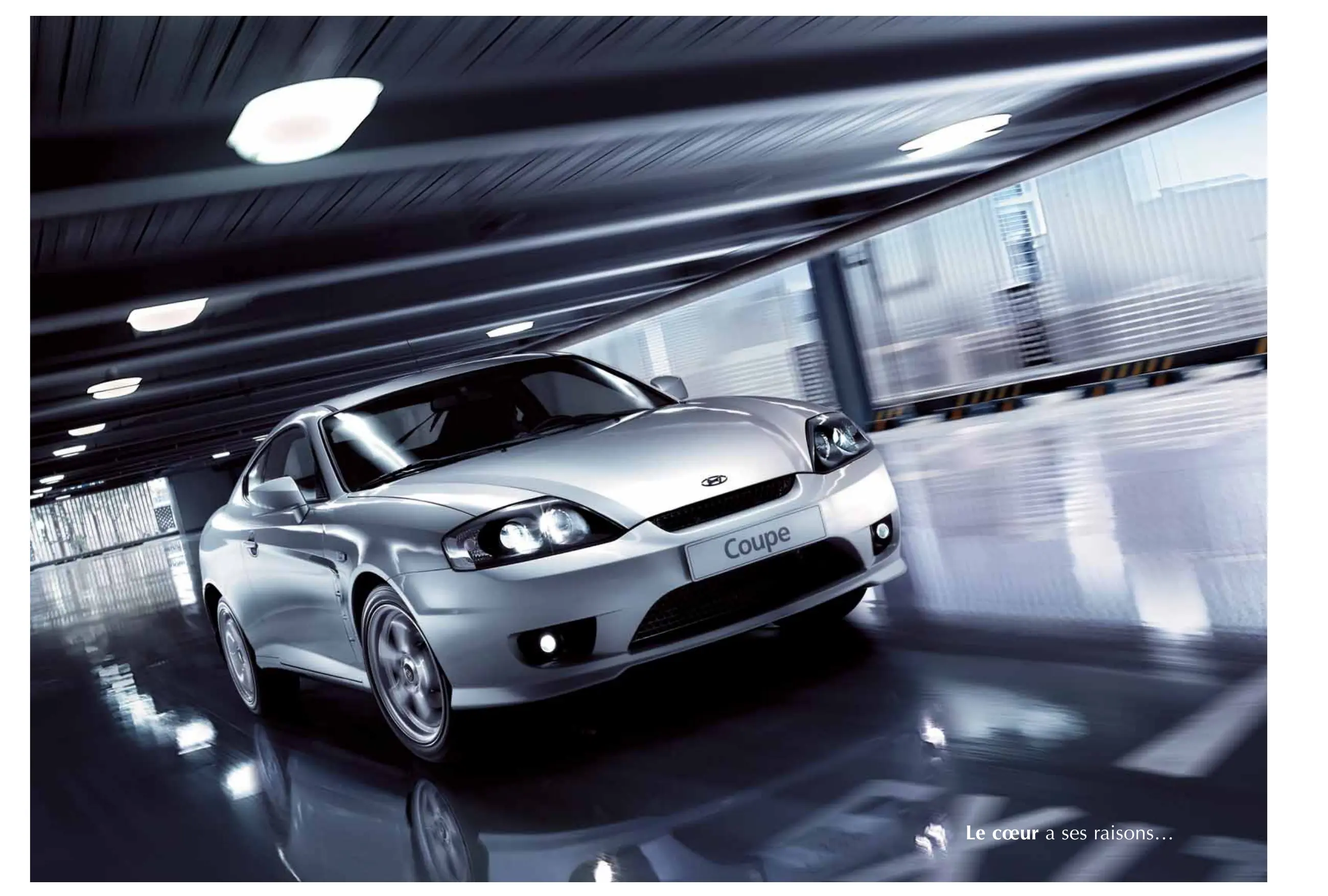 Tél : 01.34.30.60.60 - Fax : 01.34.30.60.08 - www.hyundai.fr SAS au Capital de 5 780 000 € - RCS Pontoise B 411 394 893 (1997 B 00595) Octobre 2005 - R.C. Pontoise B 562 059 717 (81 B 76) Coupe Le cœur a ses raisons… Becquet et bavettes disponibles en accessoires Tous les prétextes sont bons pour se faire plaisir Des réunions qui se succèdent, un dîner d'affaire à l'autre bout de la ville, rendre visite à de la famille éloignée, toutes les raisons sont bonnes pour prendre le volant de votre Coupé Hyundai. Posé et l'air déterminé, il incarne la passion de la conduite selon Hyundai. Sa ligne élancée, son profil sculpté, ses traits délicatement ciselés sont autant d'éléments affirmant son élégance et sa modernité. Bavettes disponibles en accessoires Becquet et bavettes disponibles en accessoires Prenez le temps d'apprécier Quel que soit l'angle sous lequel vous le regardez, le Coupé Hyundai impressionne. La large prise d'air dans le bouclier avant, intégrant les feux antibrouillards, ne laisse aucun doute quant à sa vocation sportive. L'arrière du Coupé Hyundai est également très soigné : ne soyez pas égoïste, cette vue sera la plus courante pour les autres automobilistes. Outre l'esthétisme, ce design favorise une stabilité exceptionnelle, diminue les bruits d'air et participe à une consommation raisonnable grâce à une pénétration dans l'air très étudiée. Becquet et bavettes disponibles en accessoires Le modèle d’autoradio peut différer du modèle présenté Sellerie de la version Edition Spéciale Le modèle d’autoradio peut différer du modèle présenté Un habitacle à l'image du design extérieur Voici un intérieur dans lequel vous vous sentirez à votre aise. L'habitacle soigné du Coupé Hyundai vous apporte la certitude de milliers de kilomètres parcourus dans le plus grand confort qui soit. Les sièges en cuir et tissu, avec surpiqûres rouges, les touches métal sur les contre-portes et la console centrale apportent de surcroît une ambiance unique. Enfin, le Coupé Hyundai, c’est un habitacle assez vaste pour acceuillir 4 personnes et tous leurs bagages grâce un volume de coffre de plus de 300 litres. Siège en cuir de la version PACK Luxe Becquet et bavettes disponibles en accessoires Prêt à vous remettre au sport ? Vous aimez conduire ? Alors le Coupé Hyundai est fait pour vous, il n'attend qu'une seule chose : que vous le laissiez s'exprimer pleinement, que vous le libériez. Une longue ligne droite, un virage, une épingle… peu importe, vous êtes rivés à la route. Le travail des suspensions et les performances du moteur créent une symbiose à laquelle vous ne pouvez plus résister. Becquet et bavettes disponibles en accessoires Becquet disponible en accessoires La performance pour passion Le moteur 2.0 litres offre des performances remarquables : ce 4 cylindres en ligne, qui développe 105.1 kW (143 ch) à 6000 tr/mn, procure un fonctionnement onctueux à la mélodie agréable et une efficacité maximale. Vif et souple, ce moteur vous comblera par son agrément général d'utilisation et par ses excellentes performances. Le Coupé Hyundai est disponible avec une transmission manuelle à 5 rapports ou bien une transmission automatique / séquentielle à 4 rapports (disponible en option). Grâce à sa suspension indépendante sur les 4 roues, le Coupé Hyundai offre une tenue de route et un confort étonnant pour un plaisir de conduite total, quelle que soit la vitesse. La conception même du Coupé Hyundai lui procure un comportement routier irréprochable grâce à un centre de gravité extrêmement bas. Le système antiblocage des roues, les 4 freins à disques et le répartiteur électronique de la force de freinage (EBD) assurent au Coupé Hyundai des distances d'arrêt ultra courtes et une endurance à toute épreuve. Coussins gonflables de sécurité Les coussins gonflables de sécurité frontaux à technologie intelligente réduisent les risques de déploiement accidentel lors d'une collision à vitesse réduite. Pour la sécurité aussi, le Coupé Hyundai est dans le peloton de tête A bord du Coupé Hyundai, vous serez rassurés de savoir que sont présents des éléments de sécurité passive et active performants. Vous avez la sensation d’être protégé. Prétensionneurs Avant le déploiement des coussins gonflables de sécurité, les ceintures de sécurité se tendent pour plaquer les occupants contre leur siège, puis les limiteurs d'effort relâchent la pression exercée lorsque les coussins gonflables de sécurité sont entrés en action. Becquet et bavettes disponibles en accessoires Sa conception en acier lui permet d'afficher une très bonne résistance à tous les types d'impacts. Les zones d'absorption à déformation programmée atténuent, dans la limite des lois de la physique, les effets d'un choc frontal. Des barres de renfort latéral se chargent de vous protéger des autres types de chocs. Pour parfaire ce dispositif, les passagers avant bénéficient de coussins gonflables frontaux et latéraux tête / thorax. Repousser les limites Becquet et bavettes disponibles en accessoires Le Coupé Hyundai a été conçu pour vous satisfaire. Le résultat parle de lui-même. Résolument moderne, il appartient à la longue tradition des coupés sportifs deux portes. Il tient sa promesse de performance tout en restant confortable. Mais le mieux est encore d'en prendre le volant… Un regard perçant Les nouveaux feux avant, à fond noir avec des clignotants transparents, réaffirment son look sportif. Les feux de croisement lenticulaires vous assurent un éclairage puissant. La technologie dédiée au respect de l’environnement Avec Hyundai, un monde plus propre n’est plus un rêve. C'est une réalité grandissante qui est permise grâce aux nouvelles technologies que nous utilisons afin d’optimiser les cycles de vie des produits et pour réduire au minimum l'impact de nos véhicules 