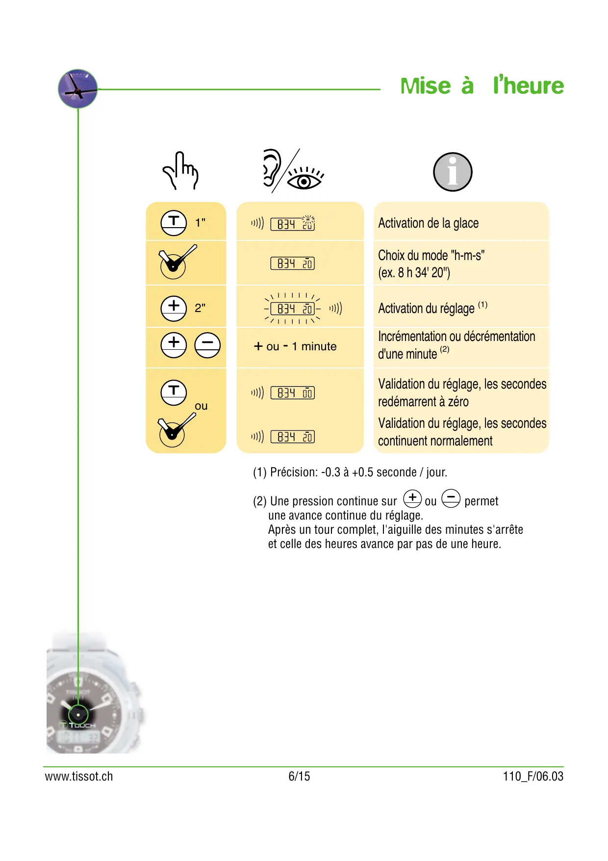 Validation du réglage, les secondes continuent normalement (1) Précision: -0.3 à +0.5 seconde / jour. (2) Une pression continue sur permet une avance continue du réglage. Après un tour complet, l'aiguille des minutes s'arrête et celle des heures avance par pas de une heure. www.tissot.ch 6/15 110_F/06.03 Mise à la date (1) Activation de la glace
