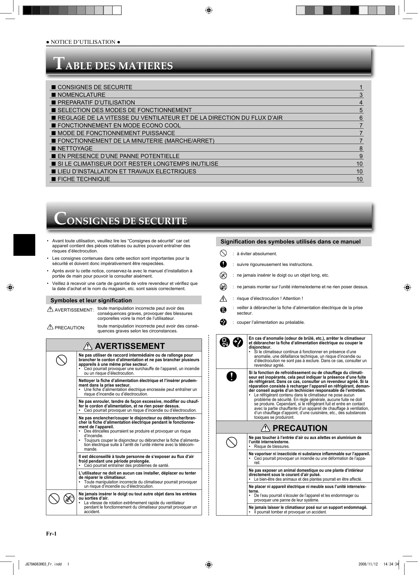 - Pour avoir la certitude d’utiliser cet appareil correctement et en toute sécurité, veuillez lire cette notice d’instructions avant de mettre le climatiseur sous tension. Français 2008/11/12 14:30:28