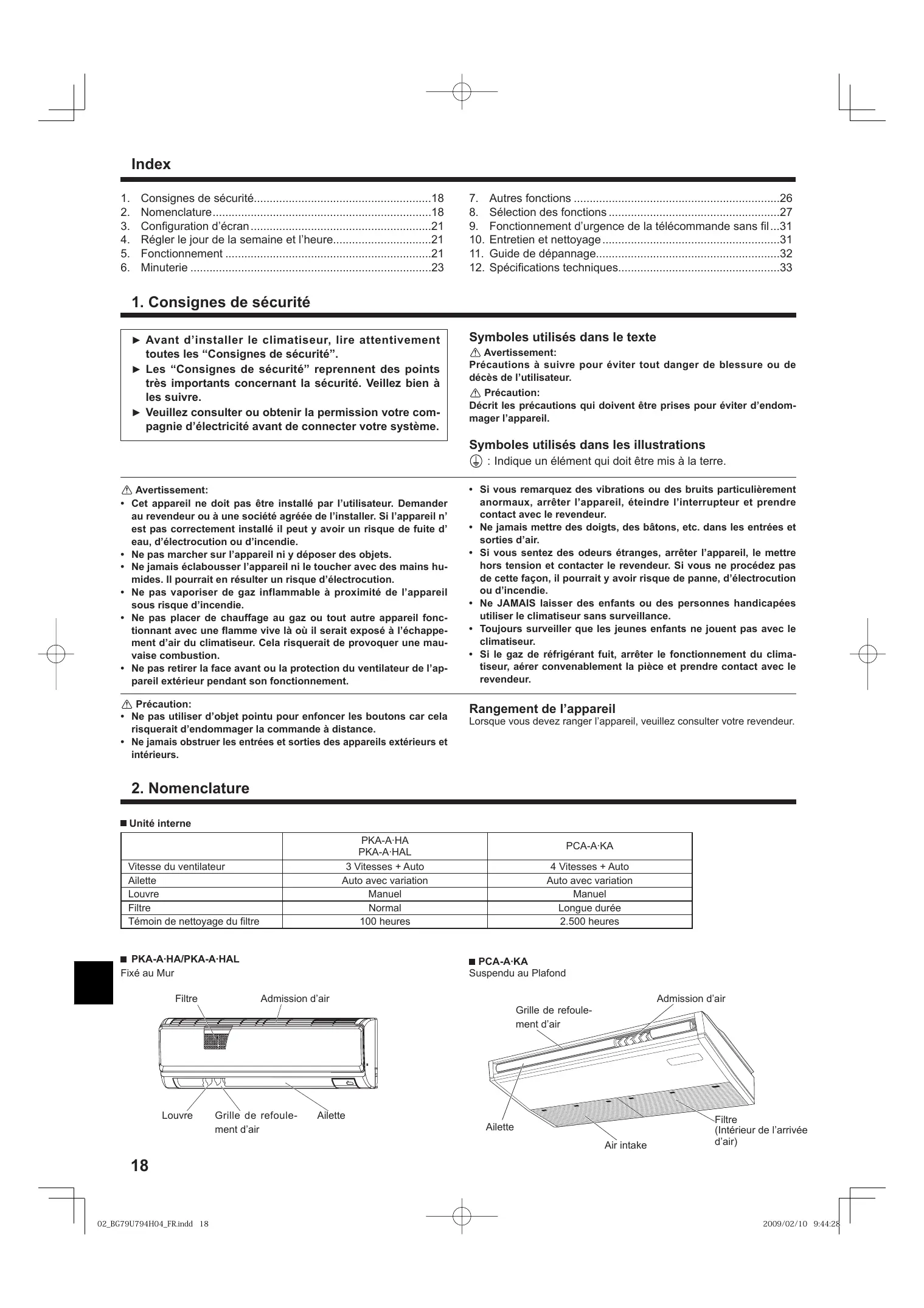 - Pour une utilisation correcte sans risques, veuillez lire le manuel d’utilisation en entier avant de vous servir du climatiseur. Consignes de sécurité p. 18