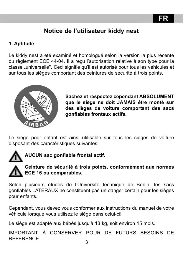 Le kiddy nest a été examiné et homologué selon la version la plus récente du règlement ECE 44-04. Il a reçu l’autorisation relative à son type pour la classe „universelle". Ceci signifie qu’il est autorisé pour tous les véhicules et sur tous les sièges comportant des ceintures de sécurité à trois points. Sachez et respectez cependant ABSOLUMENT que le siège ne doit JAMAIS être monté sur des sièges de voiture comportant des sacs gonflables frontaux actifs. Le siège pour enfant est ainsi utilisable sur tous les sièges de voiture disposant des caractéristiques suivantes: AUCUN sac gonflable frontal actif. Ceinture de sécurité à trois points, conformément aux normes ECE 16 ou comparables. Selon plusieurs études de l’Université technique de Berlin, les sacs gonflables LATERAUX ne constituent pas un danger certain pour les sièges pour enfants. Cependant, vous devez vous conformer aux instructions du manuel de votre véhicule lorsque vous utilisez le siège dans celui-ci! Le siège est adapté aux bébés jusqu’à 13 kg, soit environ 15 mois.