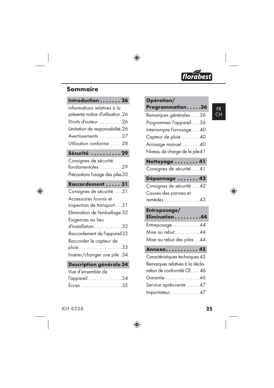 Informations relatives à la présente notice d'utilisation Cette notice d'utilisation fait partie intégrante du programmateur d'arrosage KH 4258 (désigné ci-après par appareil) et vous donne des indications importantes sur l'usage conforme, la sécurité, le raccordement ainsi que l'opération de l'appareil. La notice d'utilisation doit en tout temps être accessible à proximité de l'appareil. Elle doit être lue et respectée par toute personne qui est chargée de l'opération et du dépannage de l'appareil. Conservez cette notice d'utilisation et remettez-la au nouveau propriétaire de l'appareil. Droits d'auteur Cette documentation est protégée par les droits d'auteur. Toute reproduction de ce document, même partielle, ainsi que la réutilisation des illustrations, même sous une forme modifiée, suppose l'accord écrit du fabricant. Limitation de responsabilité L'ensemble des informations techniques, données et remarques relatives au raccordement et à l'opération contenues dans la présente notice d'utilisation sont conformes au dernier état lors du passage en presse et correspondent à nos expériences et connaissances selon notre état de connaissance le plus avancé. Aucune prétention ne peut être dérivée des indications, photos et descriptions contenues dans le présent mode d'emploi. Le fabricant n'assume aucune responsabilité pour les dommages résultant d'un non-respect de la notice d'utilisation, de l'usage non conforme, de réparations inadéquates, de modifications opérées sans autorisation ou de l'emploi de pièces de rechange non agréées.