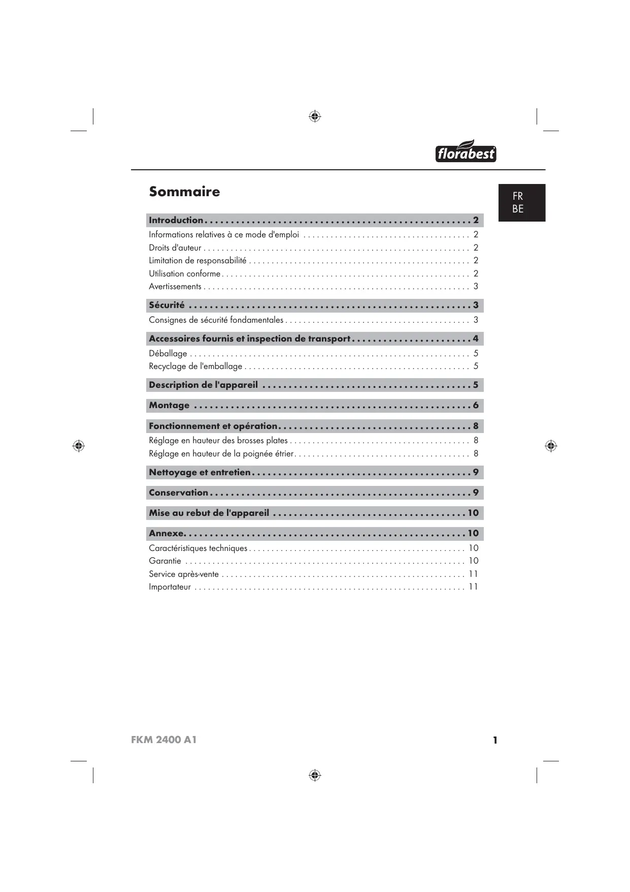 Sécurité . . . . . . . . . . . . . . . . . . . . . . . . . . . . . . . . . . . . . . . . . . . . . . . . . . . . . . 3 Consignes de sécurité fondamentales . . . . . . . . . . . . . . . . . . . . . . . . . . . . . . . . . . . . . . . . . 3 Accessoires fournis et inspection de transport . . . . . . . . . . . . . . . . . . . . . . . 4 Déballage . . . . . . . . . . . . . . . . . . . . . . . . . . . . . . . . . . . . . . . . . . . . . . . . . . . . . . . . . . . . . . 5 Recyclage de l'emballage . . . . . . . . . . . . . . . . . . . . . . . . . . . . . . . . . . . . . . . . . . . . . . . . . . 5 Description de l'appareil . . . . . . . . . . . . . . . . . . . . . . . . . . . . . . . . . . . . . . . . 5 Montage . . . . . . . . . . . . . . . . . . . . . . . . . . . . . . . . . . . . . . . . . . . . . . . . . . . . . 6 Fonctionnement et opération . . . . . . . . . . . . . . . . . . . . . . . . . . . . . . . . . . . . . 8 Réglage en hauteur des brosses plates . . . . . . . . . . . . . . . . . . . . . . . . . . . . . . . . . . . . . . . . 8 Réglage en hauteur de la poignée étrier . . . . . . . . . . . . . . . . . . . . . . . . . . . . . . . . . . . . . . . 8 Nettoyage et entretien . . . . . . . . . . . . . . . . . . . . . . . . . . . . . . . . . . . . . . . . . . 9 Conservation . . . . . . . . . . . . . . . . . . . . . . . . . . . . . . . . . . . . . . . . . . . . . . . . . . 9 Mise au rebut de l'appareil . . . . . . . . . . . . . . . . . . . . . . . . . . . . . . . . . . . . . 10 Annexe. . . . . . . . . . . . . . . . . . . . . . . . . . . . . . . . . . . . . . . . . . . . . . . . . . . . . . 10 Caractéristiques techniques . . . . . . . . . . . . . . . . . . . . . . . . . . . . . . . . . . . . . . . . . . . . . . . . Garantie . . . . . . . . . . . . . . . . . . . . . . . . . . . . . . . . . . . . . . . . . . . . . . . . . . . . . . . . . . . . . . Service après-vente . . . . . . . . . . . . . . . . . . . . . . . . . . . . . . . . . . . . . . . . . . . . . . . . . . . . . . Importateur . . . . . . . . . . . . . . . . . . . . . . . . . . . . . . . . . . . . . . . . . . . . . . . . . . . . . . . . . . . . FKM 2400 A1