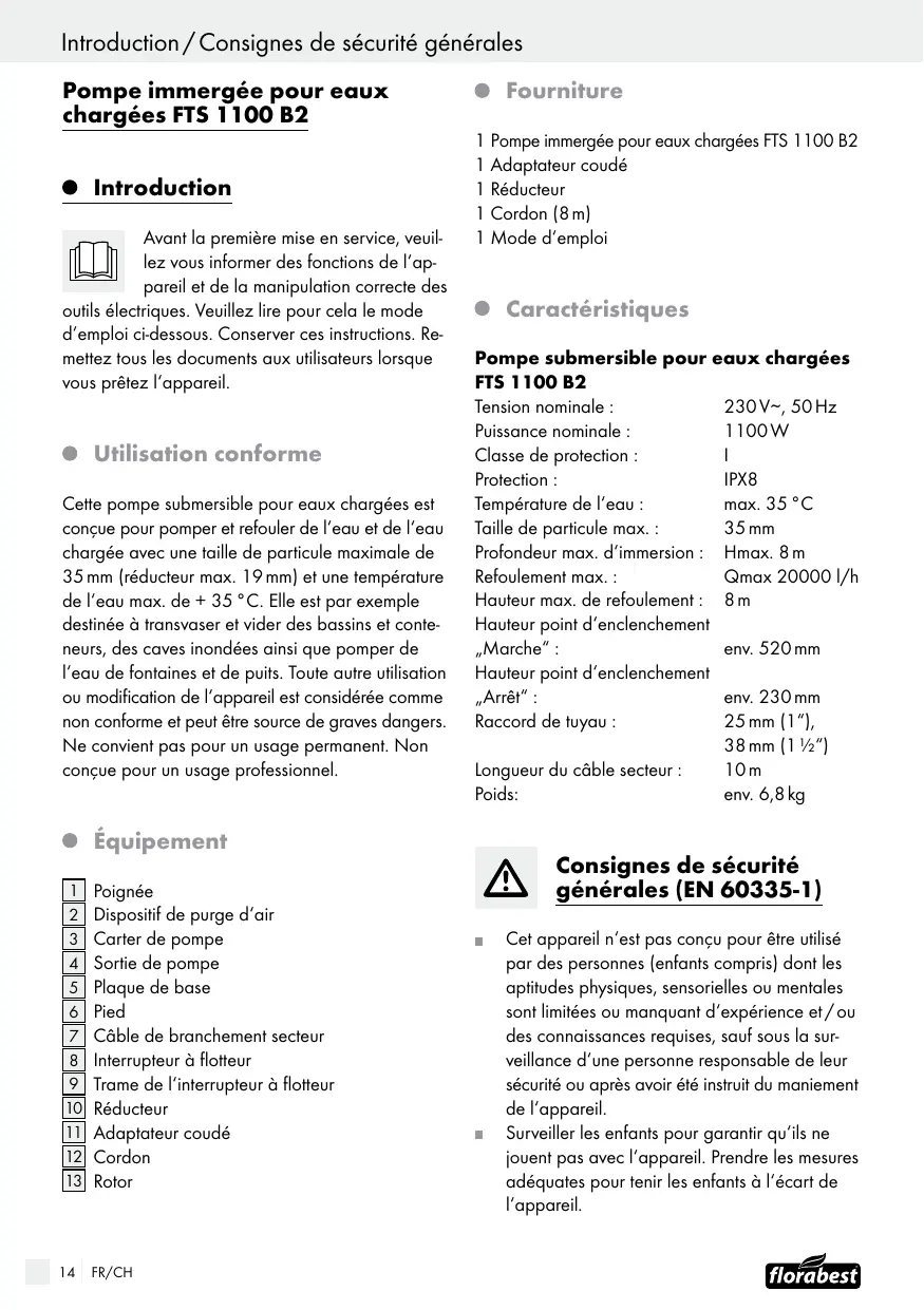 Poignée Dispositif de purge d‘air Carter de pompe Sortie de pompe Plaque de base Pied Câble de branchement secteur Interrupteur à flotteur Trame de l‘interrupteur à flotteur Réducteur Adaptateur coudé Cordon Rotor FR/CH Fourniture 1 Pompe immergée pour eaux chargées FTS 1100 B2 1 Adaptateur coudé 1 Réducteur 1 Cordon (8 m) 1 Mode d‘emploi Caractéristiques Pompe submersible pour eaux chargées FTS 1100 B2 Tension nominale : 230 V∼, 50 Hz Puissance nominale : 1100 W Classe de protection : Protection : IPX8 Température de l‘eau : max. 35 °C Taille de particule max. : 35 mm Profondeur max. d‘immersion : Hmax. 8 m Refoulement max. : Qmax 20000 l/h Hauteur max. de refoulement : 8 m Hauteur point d‘enclenchement „Marche“ : env. 520 mm Hauteur point d‘enclenchement „Arrêt“ : env. 230 mm Raccord de tuyau : 25 mm (1“), 38 mm (1 ½“) Longueur du câble secteur : 10 m Poids: env. 6,8 kg onsignes de sécurité générales (EN 60335-1) et appareil n‘est pas conçu pour être utilisé par des personnes (enfants compris) dont les aptitudes physiques, sensorielles ou mentales sont limitées ou manquant d‘expérience et / ou des connaissances requises, sauf sous la surveillance d‘une personne responsable de leur sécurité ou après avoir été instruit du maniement de l‘appareil. Surveiller les enfants pour garantir qu‘ils ne jouent pas avec l‘appareil. Prendre les mesures adéquates pour tenir les enfants à l‘écart de l‘appareil.