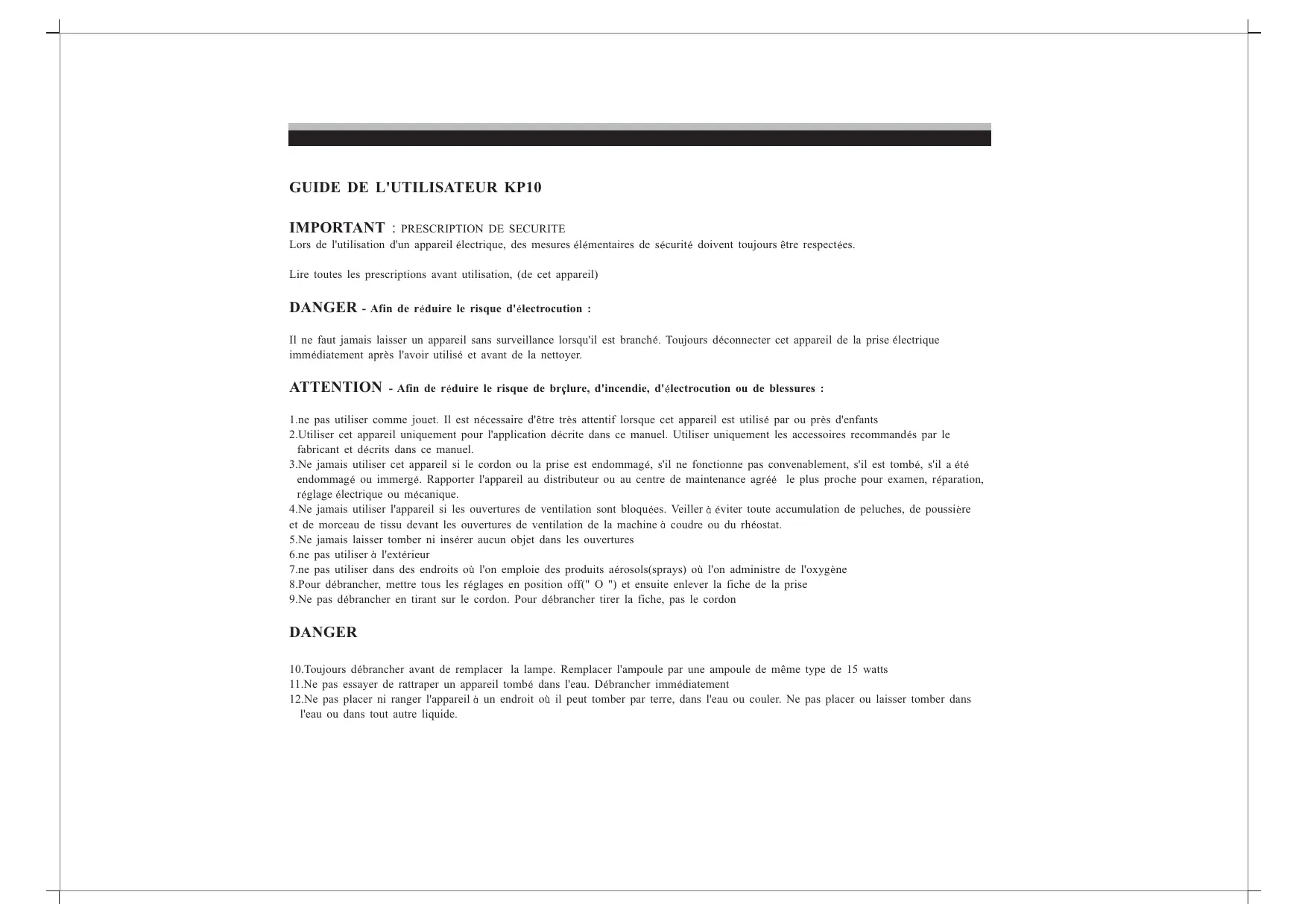 1.ne pas utiliser comme jouet. Il est n cessaire d' tre tr s attentif lorsque cet appareil est utilis par ou pr s d'enfants 2.Utiliser cet appareil uniquement pour l'application d crite dans ce manuel. Utiliser uniquement les accessoires recommand s par le fabricant et d crits dans ce manuel. 3.Ne jamais utiliser cet appareil si le cordon ou la prise est endommag , s'il ne fonctionne pas convenablement, s'il est tomb , s'il a t endommag ou immerg . Rapporter l'appareil au distributeur ou au centre de maintenance agr le plus proche pour examen, r paration, r glage lectrique ou m canique. 4.Ne jamais utiliser l'appareil si les ouvertures de ventilation sont bloqu es. Veiller viter toute accumulation de peluches, de poussi re et de morceau de tissu devant les ouvertures de ventilation de la machine coudre ou du rh ostat. 5.Ne jamais laisser tomber ni ins rer aucun objet dans les ouvertures 6.ne pas utiliser l'ext rieur 7.ne pas utiliser dans des endroits o l'on emploie des produits a rosols(sprays) o l'on administre de l'oxyg ne 8.Pour d brancher, mettre tous les r glages en position off(" O ") et ensuite enlever la fiche de la prise 9.Ne pas d brancher en tirant sur le cordon. Pour d brancher tirer la fiche, pas le cordon DANGER 10.Toujours d brancher avant de remplacer la lampe. Remplacer l'ampoule par une ampoule de m me type de 15 watts 11.Ne pas essayer de rattraper un appareil tomb dans l'eau. D brancher imm diatement 12.Ne pas placer ni ranger l'appareil un endroit o il peut tomber par terre, dans l'eau ou couler. Ne pas placer ou laisser tomber dans l'eau ou dans tout autre liquide. ATTENTION 13.Eloigner les doigts de toutes les parties en mouvement. Il faut faire particuli rement attention au niveau de l'aiguille de la machine coudre 14.Toujours utiliser la plaque aiguille appropri e. Si vous n'utilisez pas la plaque appropri e, l'aiguille peut casser 15.Ne pas utiliser d'aiguilles tordues. 16.Ne pas pousser ni tirer le tissu pendant que vous cousez. Cette manoeuvre peut faire d vier l'aiguille et la casser 17.Eteindre la machine coudre (position " o ") lors de tout r glage, comme enfiler l'aiguille, enfiler une bobine, ou changer le pied de biche, etc., dans la zone de l'aiguille. 18.Toujours d connecter la machine coudre de la prise lectrique lorsque vous enlevez les couvercles, que vous lubrifiez ou que vous effectuez tout autre r glage mentionn dans le manuel d'utilisation