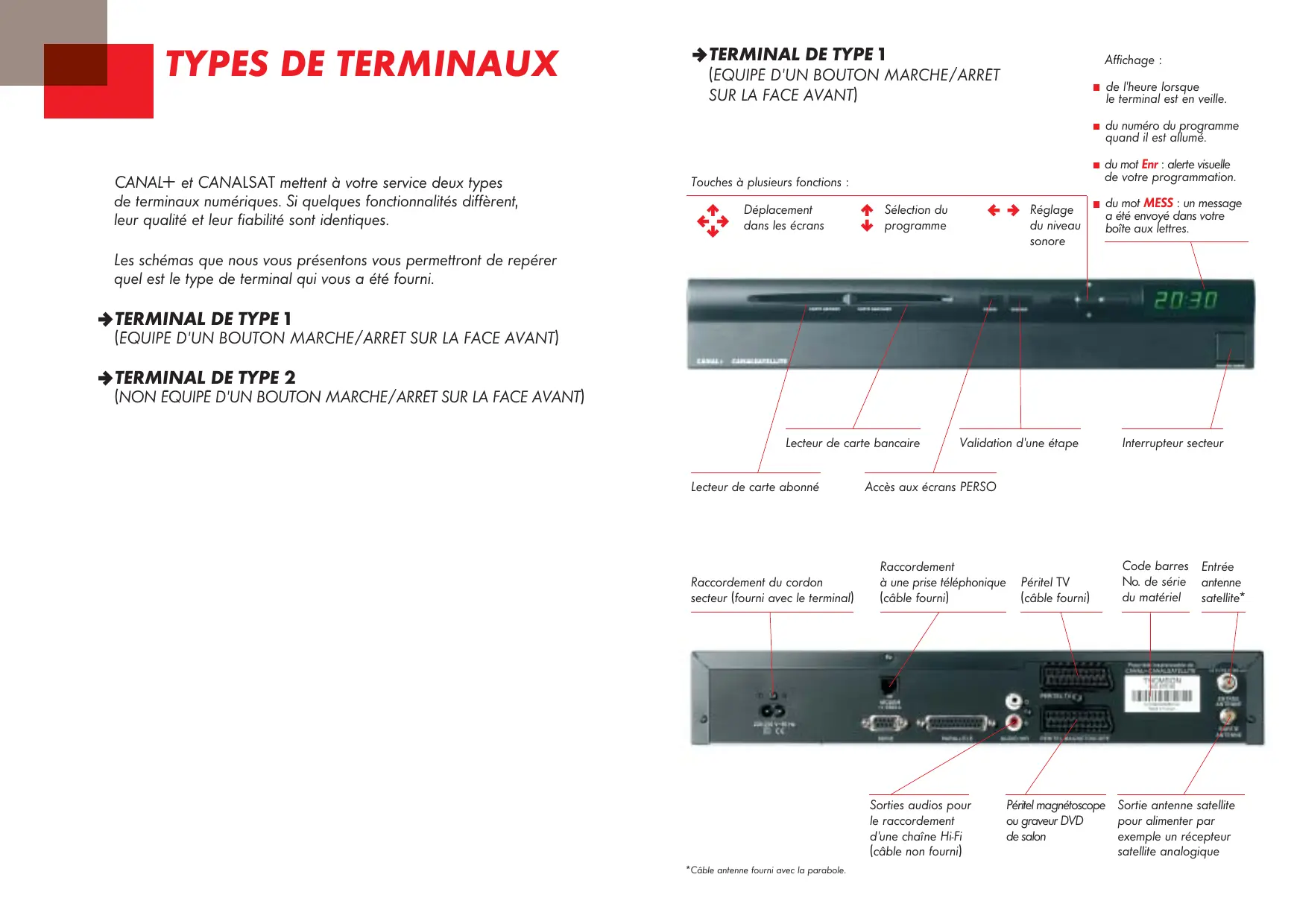 Affichage : (ÉQUIPÉ D’UN BOUTON MARCHE/ARRÊT SUR LA FACE AVANT) de l’heure lorsque le terminal est en veille. du numéro du programme quand il est allumé. ¢ et CANALSAT mettent à votre service deux types de terminaux numériques. Si quelques fonctionnalités diffèrent, leur qualité et leur fiabilité sont identiques. du mot Enr : alerte visuelle de votre programmation. Touches à plusieurs fonctions :