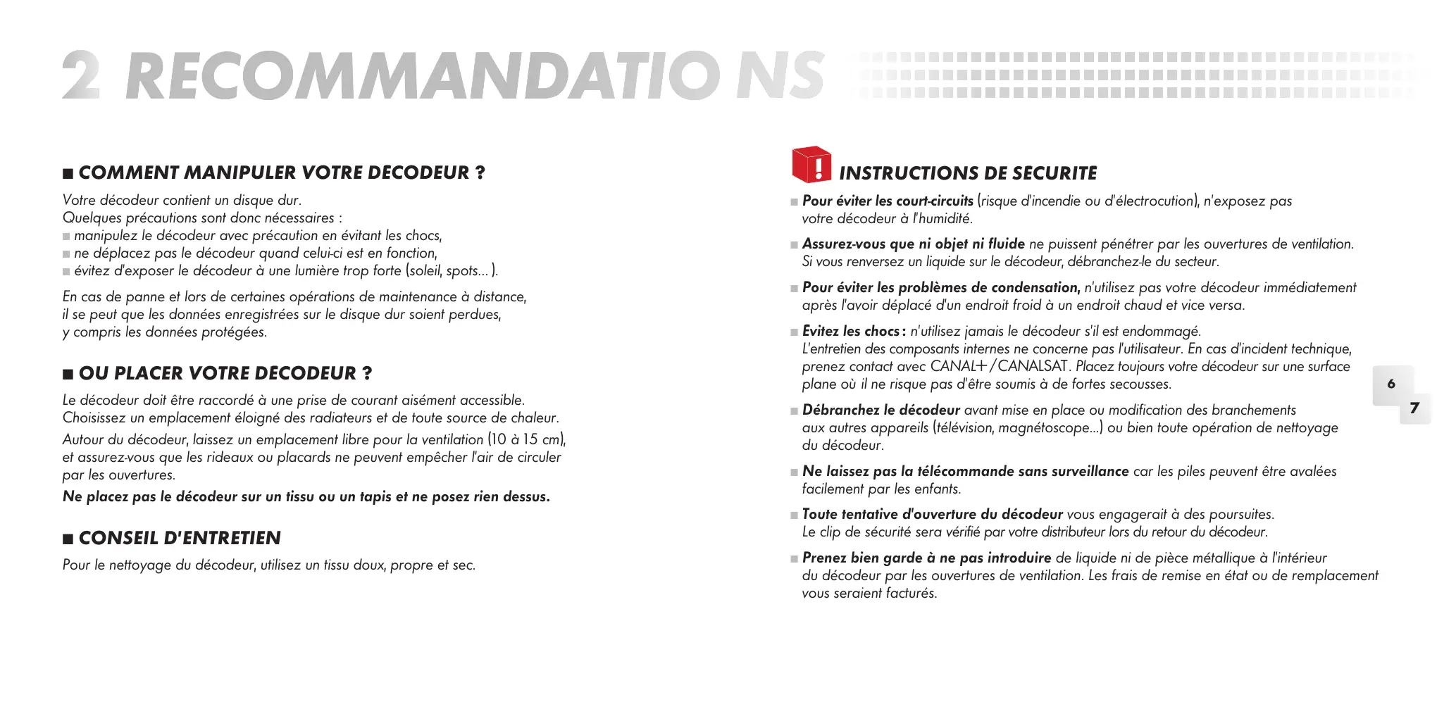 COMMENT MANIPULER VOTRE DÉCODEUR ? Votre décodeur contient un disque dur. Quelques précautions sont donc nécessaires : ■ manipulez le décodeur avec précaution en évitant les chocs, ■ ne déplacez pas le décodeur quand celui-ci est en fonction, ■ évitez d’exposer le décodeur à une lumière trop forte (soleil, spots…). En cas de panne et lors de certaines opérations de maintenance à distance, il se peut que les données enregistrées sur le disque dur soient perdues, y compris les données protégées.