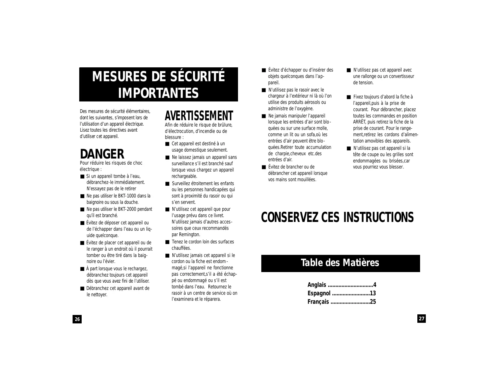IMPORTANTES Des mesures de sécurité élémentaires, dont les suivantes, s’imposent lors de l’utilisation d’un appareil électrique. Lisez toutes les directives avant d’utiliser cet appareil. DANGER Pour réduire les risques de choc électrique : ■ Si un appareil tombe à l’eau, débranchez-le immédiatement. N’essayez pas de le retirer ■ Ne pas utiliser le BKT-1000 dans la baignoire ou sous la douche. ■ Ne pas utiliser le BKT-2000 pendant qu’il est branché. ■ Évitez de déposer cet appareil ou de l’échapper dans l’eau ou un liquide quelconque. ■ Évitez de placer cet appareil ou de le ranger à un endroit où il pourrait tomber ou être tiré dans la baignoire ou l’évier. ■ À part lorsque vous le rechargez, débranchez toujours cet appareil dès que vous avez fini de l’utiliser. ■ Débranchez cet appareil avant de le nettoyer.