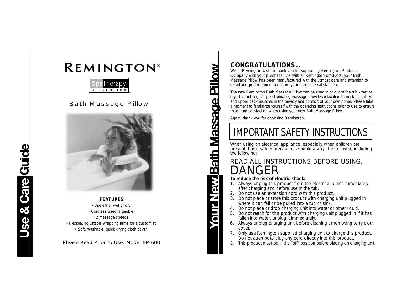 BP-600 - Oreiller de massage pour bain REMINGTON - Notice d'utilisation et mode d'emploi gratuit