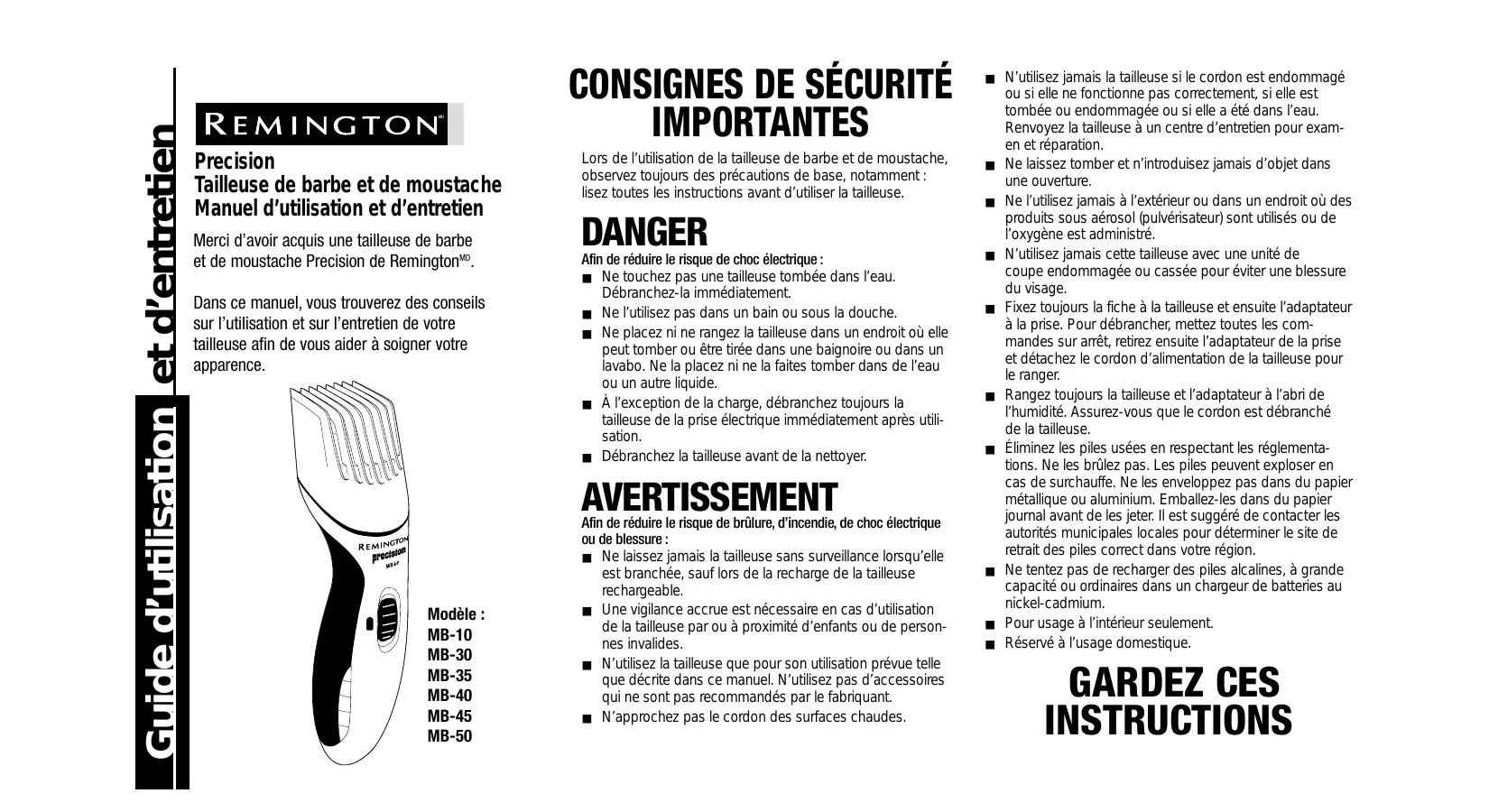 AVERTISSEMENT Modèle : MB-10 MB-30 MB-35 MB-40 MB-45 MB-50 Afin de réduire le risque de brûlure, d’incendie, de choc électrique ou de blessure : ■ Ne laissez jamais la tailleuse sans surveillance lorsqu’elle est branchée, sauf lors de la recharge de la tailleuse rechargeable. ■ Une vigilance accrue est nécessaire en cas d’utilisation de la tailleuse par ou à proximité d’enfants ou de personnes invalides. ■ N’utilisez la tailleuse que pour son utilisation prévue telle que décrite dans ce manuel. N’utilisez pas d’accessoires qui ne sont pas recommandés par le fabriquant. ■ N’approchez pas le cordon des surfaces chaudes.