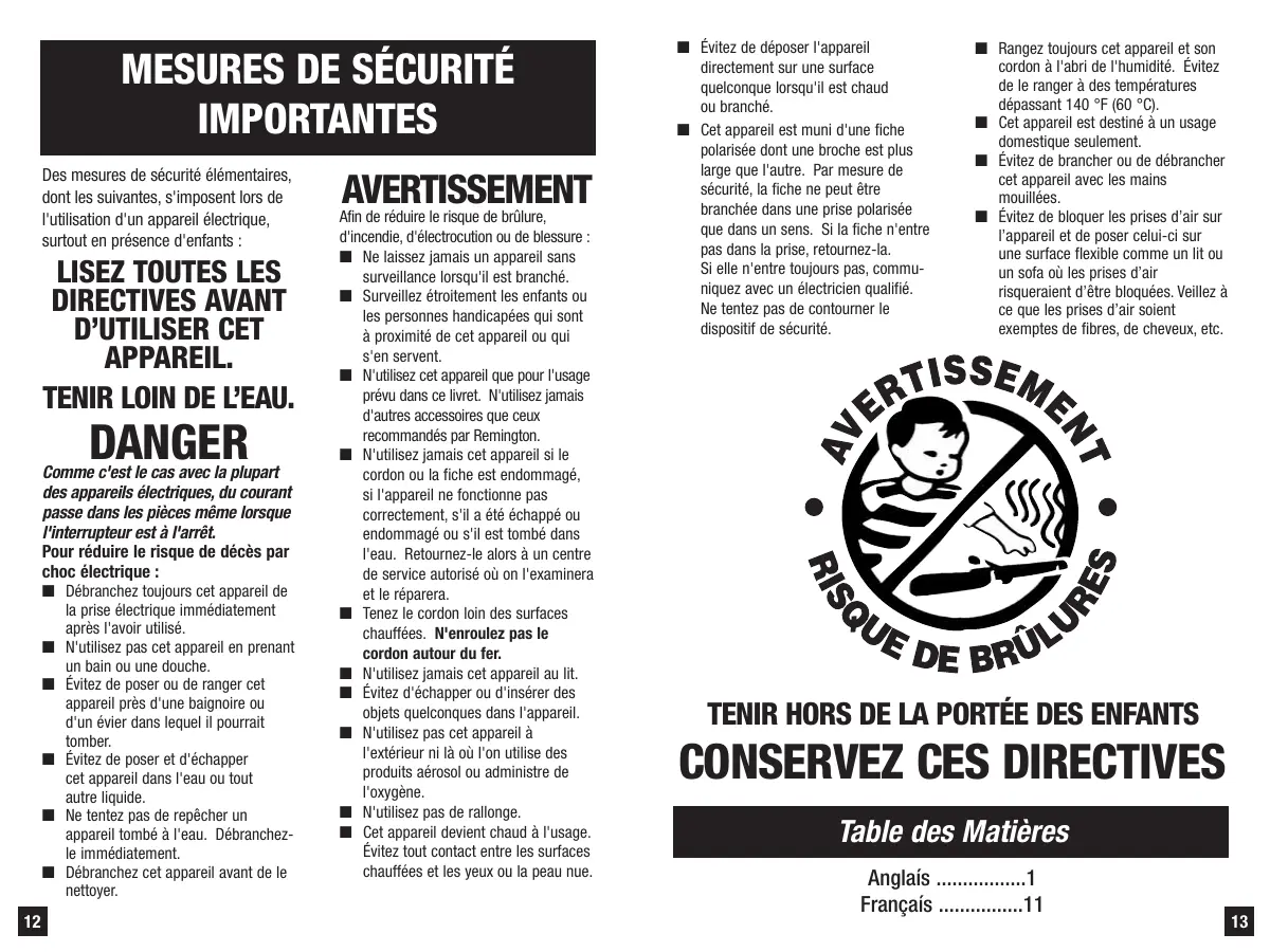 N'utilisez cet apparéil que pour l'utilisation prévu dans ce livre. N'utilisez jamais d'autres accessoires que ceux recommendés par Remington.