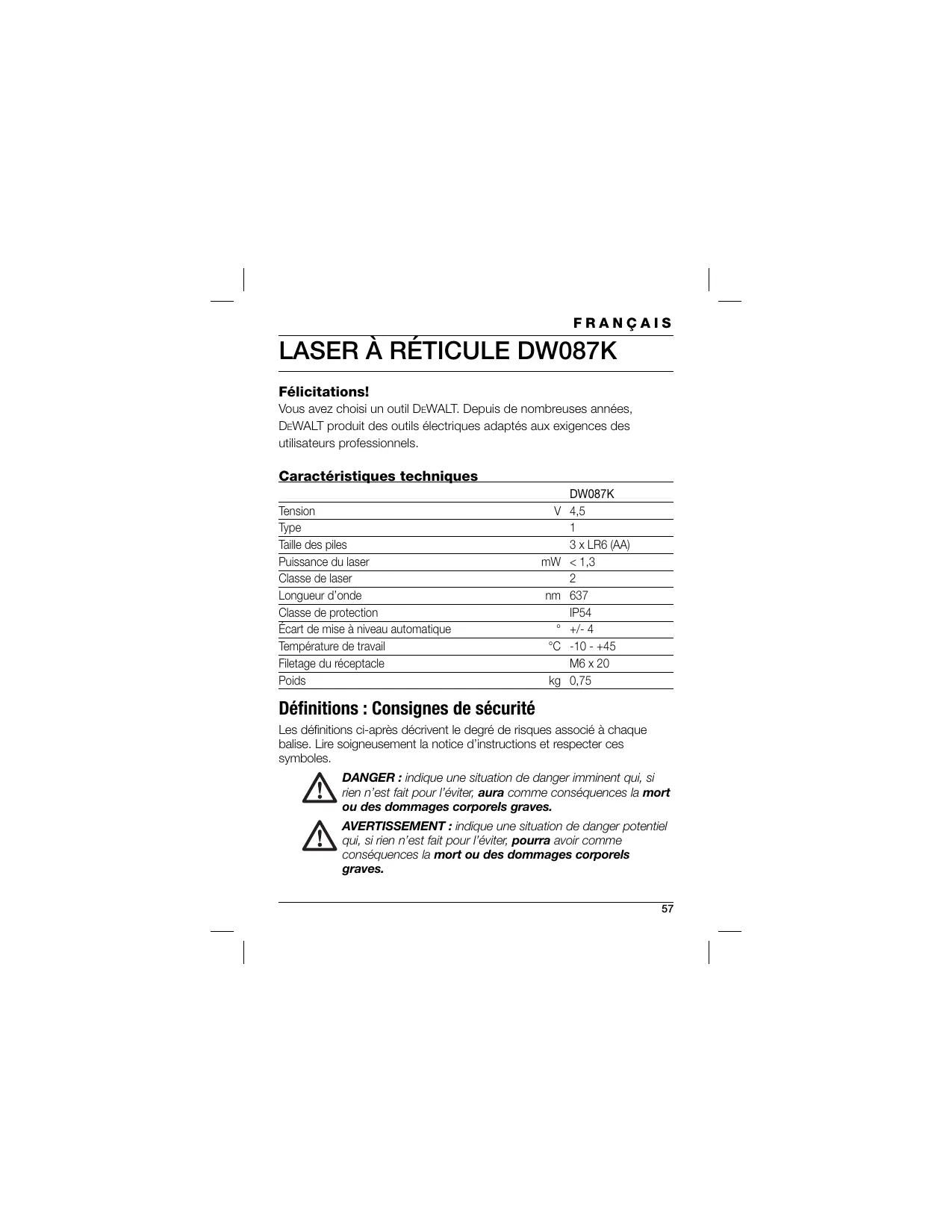 Félicitations! Vous avez choisi un outil DEWALT. Depuis de nombreuses années, DEWALT produit des outils électriques adaptés aux exigences des utilisateurs professionnels. Caractéristiques techniques Tension Type Taille des piles Puissance du laser Classe de laser Longueur d’onde Classe de protection Écart de mise à niveau automatique Température de travail Filetage du réceptacle Poids DW087K V 4,5 3 x LR6 (AA) mW < 1,3 nm 637 IP54 ° +/- 4 °C -10 - +45 M6 x 20 kg 0,75 Définitions : Consignes de sécurité Les définitions ci-après décrivent le degré de risques associé à chaque balise. Lire soigneusement la notice d’instructions et respecter ces symboles.