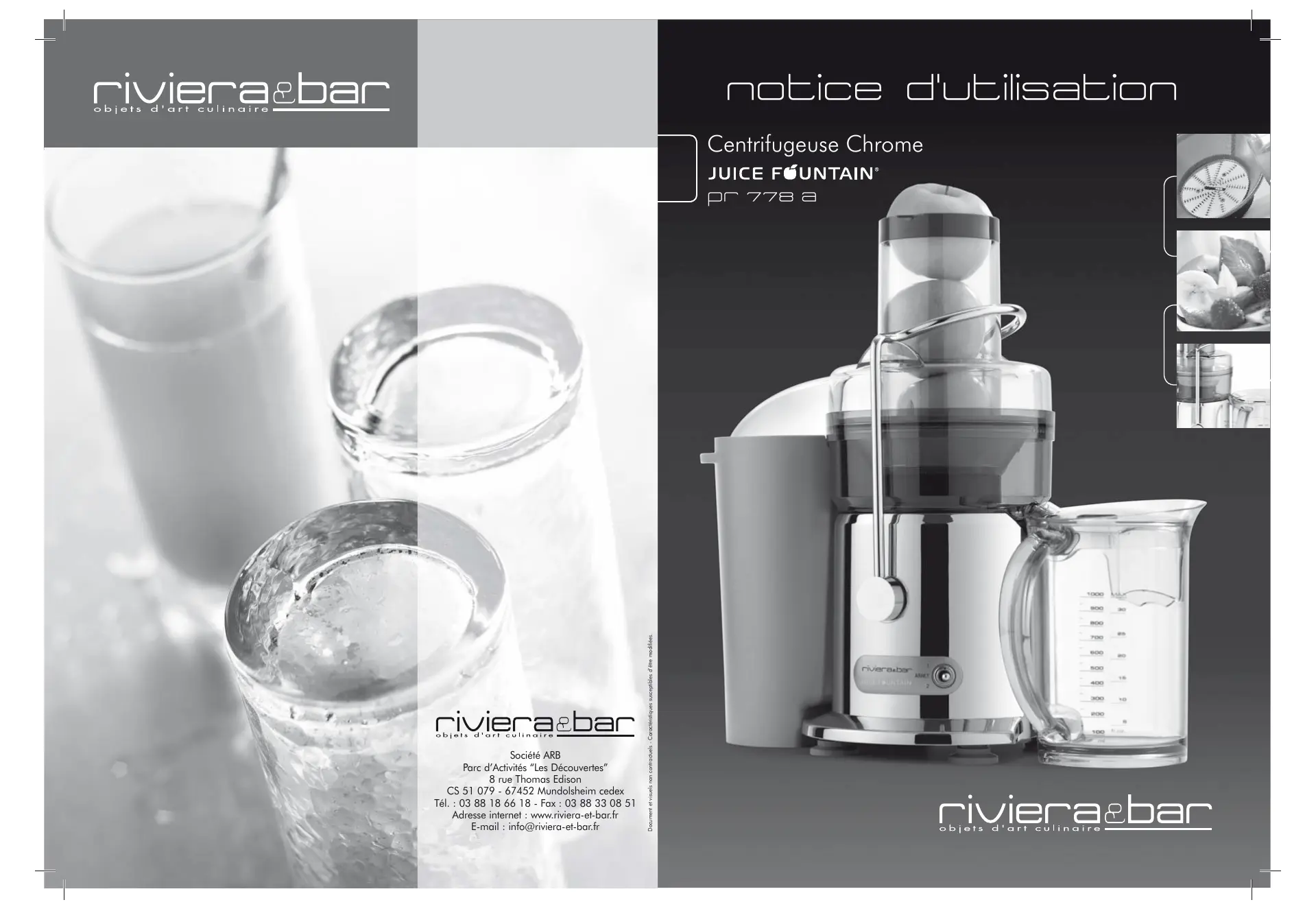 notice d'utilisation Centrifugeuse Chrome Société ARB Parc d’Activités “Les Découvertes” 8 rue Thomas Edison CS 51 079 - 67452 Mundolsheim cedex Tél. : 03 88 18 66 18 - Fax : 03 88 33 08 51 Adresse internet : www.riviera-et-bar.fr E-mail : info@riviera-et-bar.fr Document et visuels non contractuels - Caractéristiques susceptibles d’être modifiées. pr 778 a description du produit Avec cet appareil, vous avez fait l’acquisition d’un article de qualité, bénéficiant de toute l’expérience de Riviera & Bar dans le domaine de la préparation alimentaire. Il répond aux critères de qualité Riviera & Bar : les meilleurs matériaux et composants ont été utilisés pour sa fabrication, et il a été soumis à des contrôles rigoureux. Nous souhaitons que son usage vous apporte entière satisfaction. Nous vous demandons de lire très attentivement les instructions indiquées dans cette notice, car elles fournissent, entre autres, des informations importantes relatives à la sécurité d’installation, d’utilisation et d’entretien. Gardez votre notice, vous pourriez avoir besoin de vous y référer dans le futur. description du produit