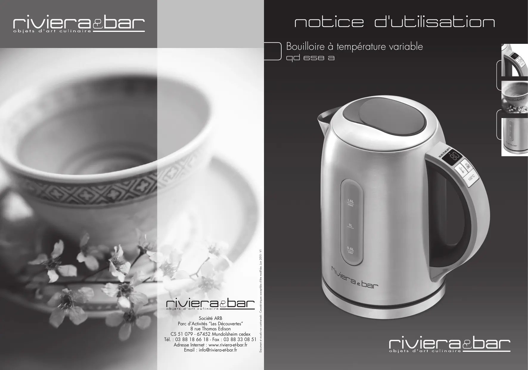 notice d'utilisation Société ARB Parc d’Activités “Les Découvertes” 8 rue Thomas Edison CS 51 079 - 67452 Mundolsheim cedex Tél. : 03 88 18 66 18 - Fax : 03 88 33 08 51 Adresse Internet : www.riviera-et-bar.fr Email : info@riviera-et-bar.fr Document et visuels non contractuels - Caractéristiques susceptibles d’être modifiées. Juin 2010 - V1 Bouilloire à température variable qd 658 a Avec cet appareil, vous avez fait l’acquisition d’un article de qualité, bénéficiant de toute l’expérience de Riviera & Bar dans le domaine de la préparation de boissons. Il répond aux critères de qualité Riviera & Bar : les meilleurs matériaux et composants ont été utilisés pour sa fabrication, et il a été soumis à des contrôles rigoureux. Nous souhaitons que son usage vous apporte entière satisfaction. Nous vous instructions fournissent, relatives à d’entretien. demandons de lire très attentivement les indiquées dans cette notice, car elles entre autres, des informations importantes la sécurité d’installation, d’utilisation et Gardez votre notice, vous pourriez avoir besoin de vous y référer dans le futur.