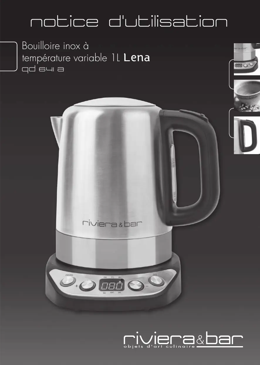 notice d'utilisation Bouilloire inox à température variable 1L qd 641 a Lena Avec cet appareil, vous avez fait l’acquisition d’un article de qualité, bénéficiant de toute l’expérience de Riviera & Bar dans le domaine de la préparation de boissons. Il répond aux critères de qualité Riviera & Bar : les meilleurs matériaux et composants ont été utilisés pour sa fabrication, et il a été soumis à des contrôles rigoureux. Nous souhaitons que son usage vous apporte entière satisfaction. Nous vous instructions fournissent, relatives à d’entretien. demandons de lire très attentivement les indiquées dans cette notice, car elles entre autres, des informations importantes la sécurité d’installation, d’utilisation et Gardez votre notice, vous pourriez avoir besoin de vous y référer dans le futur.