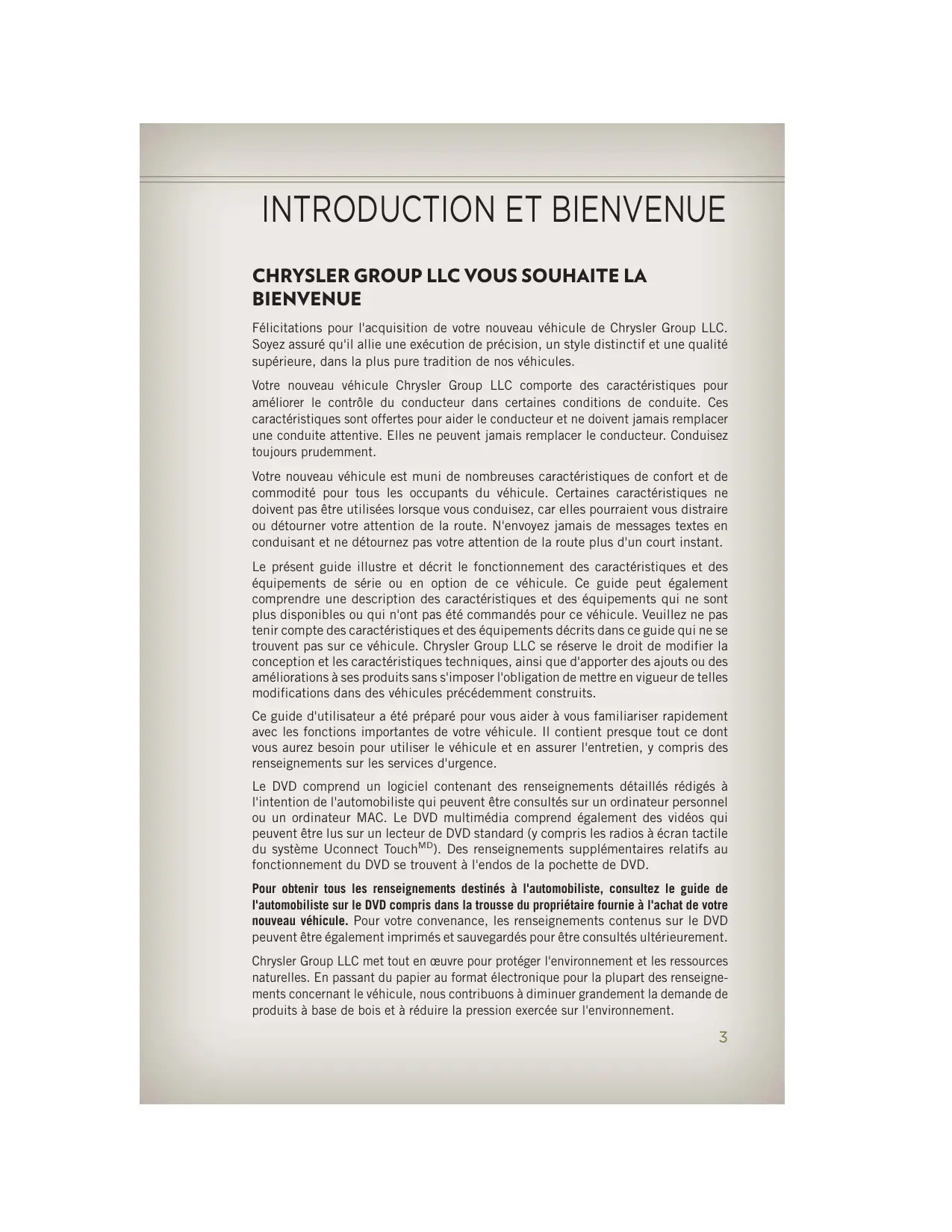 BIENVENUE Félicitations pour l'acquisition de votre nouveau véhicule de Chrysler Group LLC. Soyez assuré qu'il allie une exécution de précision, un style distinctif et une qualité supérieure, dans la plus pure tradition de nos véhicules. Votre nouveau véhicule Chrysler Group LLC comporte des caractéristiques pour améliorer le contrôle du conducteur dans certaines conditions de conduite. Ces caractéristiques sont offertes pour aider le conducteur et ne doivent jamais remplacer une conduite attentive. Elles ne peuvent jamais remplacer le conducteur. Conduisez toujours prudemment. Votre nouveau véhicule est muni de nombreuses caractéristiques de confort et de commodité pour tous les occupants du véhicule. Certaines caractéristiques ne doivent pas être utilisées lorsque vous conduisez, car elles pourraient vous distraire ou détourner votre attention de la route. N'envoyez jamais de messages textes en conduisant et ne détournez pas votre attention de la route plus d'un court instant. Le présent guide illustre et décrit le fonctionnement des caractéristiques et des équipements de série ou en option de ce véhicule. Ce guide peut également comprendre une description des caractéristiques et des équipements qui ne sont plus disponibles ou qui n'ont pas été commandés pour ce véhicule. Veuillez ne pas tenir compte des caractéristiques et des équipements décrits dans ce guide qui ne se trouvent pas sur ce véhicule. Chrysler Group LLC se réserve le droit de modifier la conception et les caractéristiques techniques, ainsi que d'apporter des ajouts ou des améliorations à ses produits sans s'imposer l'obligation de mettre en vigueur de telles modifications dans des véhicules précédemment construits. Ce guide d'utilisateur a été préparé pour vous aider à vous familiariser rapidement avec les fonctions importantes de votre véhicule. Il contient presque tout ce dont vous aurez besoin pour utiliser le véhicule et en assurer l'entretien, y compris des renseignements sur les services d'urgence. Le DVD comprend un logiciel contenant des renseignements détaillés rédigés à l'intention de l'automobiliste qui peuvent être consultés sur un ordinateur personnel ou un ordinateur MAC. Le DVD multimédia comprend également des vidéos qui peuvent être lus sur un lecteur de DVD standard (y compris les radios à écran tactile du système Uconnect TouchMD). Des renseignements supplémentaires relatifs au fonctionnement du DVD se trouvent à l'endos de la pochette de DVD. Pour obtenir tous les renseignements destinés à l'automobiliste, consultez le guide de l'automobiliste sur le DVD compris dans la trousse du propriétaire fournie à l'achat de votre nouveau véhicule. Pour votre convenance, les renseignements contenus sur le DVD peuvent être également imprimés et sauvegardés pour être consultés ultérieurement. Chrysler Group LLC met tout en œuvre pour protéger l'environnement et les ressources naturelles. En passant du papier au format électronique pour la plupart des renseignements concernant le véhicule, nous contribuons à diminuer grandement la demande de produits à base de bois et à réduire la pression exercée sur l'environnement.