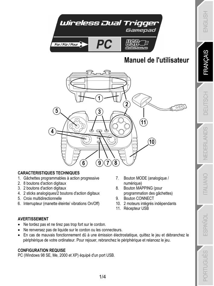 1. Insérez le CD-ROM d'installation dans votre lecteur de CD-ROM. Suivez les instructions affichées à l'écran pour installer les pilotes Force Feedback. Une fois l'installation terminée, cliquez sur Terminer et redémarrez votre ordinateur. 2. Au redémarrage de l'ordinateur, reliez le connecteur USB à l'un des ports USB de votre unité centrale. Windows 98/Me/2000/XP détectera automatiquement le nouveau périphérique. (Si vous branchez un périphérique USB pour la première fois, il est possible que, pendant l'installation, Windows vous demande d'insérer le CD-ROM Windows afin d'installer les fichiers système nécessaires.) 3. Installation des pilotes : Windows 98 : l'Assistant Ajout de nouveau matériel se charge de rechercher pour vous les pilotes appropriés. Cliquez sur Suivant. Suivez les instructions affichées à l'écran pour terminer l'installation. Windows Me/2000/XP : l'installation des pilotes est automatique. 4. Sélectionnez Démarrer/Paramètres/Panneau de configuration, puis double-cliquez sur Contrôleurs de jeu (ou Options de jeu selon votre système d'exploitation). La boîte de dialogue Contrôleurs de jeu affichera le nom de la manette avec l'état OK. Attention : la boîte de dialogue Contrôleurs de jeu ne vous permet pas de tester les effets Force Feedback de la manette. Pour ce faire, utilisez l'application « Force Feedback Test » (Démarrer/Programmes/Thrustmaster FFB Driver). FONCTIONS AVANCEES • Interrupteur (6) : - Position OFF = la manette est éteinte. - Position ON = la manette est allumée, le mode vibration est désactivé (économise les piles). - Position VIB = la manette est allumée, le mode vibration est activé (consomme davantage d'énergie). • Bouton MODE (7) : ce bouton permet de passer d'un mode à un autre. - Mode Analog (par défaut) : le bouton MODE (7) s'allume (bleu). 12 boutons d'action, stick analogique gauche (gérant les axes X et Y) et stick analogique droit (gérant les axes Z et Z rotation) et la croix multidirectionnelle (gérant 8 directions). - Mode Digital : le bouton MODE (7) est éteint. 12 boutons d'action, croix multidirectionnelle (gérant les axes X et Y) et 8 directions programmables, stick gauche (gérant 8 directions) et stick analogique droit (gérant les axes Z et Z rotation). • Bouton CONNECT (9) : ce bouton permet de passer d'un mode à un autre. - Le voyant "Connect" clignote rapidement = aucun signal entre la manette et le récepteur. - Le voyant "Connect" est allumé = présence d'un signal entre la manette et le récepteur. - Le voyant "Connect" est éteint = la manette est en mode veille. - Le voyant "Connect" clignote lentement = le niveau des piles est faible (la fonction vibration sera désactivée afin d'économiser les piles). Pour revenir à la configuration de vibration normale, il convient de changer les piles. • MODE VEILLE : - La manette s'éteint automatiquement après 5 minutes d'inactivité. - Pour la réactiver, appuyez sur l'un des boutons. • COMMUTATION AUTOMATIQUE DES CANAUX/MODE MULTIJOUEUR : - Vous pouvez utiliser jusqu'à 4 manettes Dual Trigger simultanément. Tous les canaux sont détectés automatiquement. En mode multijoueur, si vous souhaitez connecter des manettes au cours d'un jeu, appuyez simultanément sur les boutons RECEIVER et CONNECT.