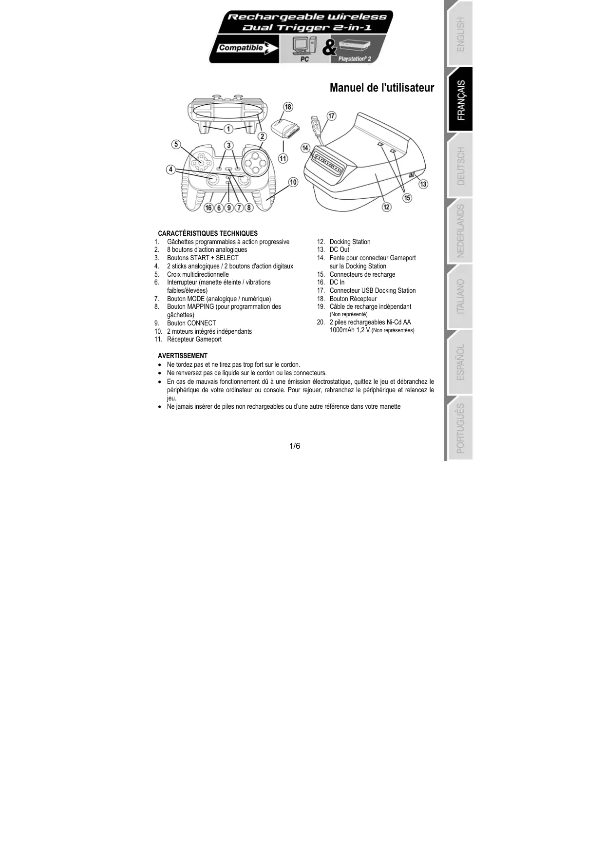 - Position OFF = la manette est éteinte. - Position VIB LOW = la manette est allumée, le mode vibrations faibles est activé (économise les piles). - Position VIB HIGH = la manette est allumée, le mode vibrations élevées est activé (consomme davantage d'énergie). Bouton MODE (7) : ce bouton permet de passer d'un mode à un autre. - Mode Analog (par défaut) : le bouton MODE (7) s'allume (bleu). - Mode Digital : le bouton MODE (7) est éteint. Bouton CONNECT (9) : ce bouton permet de passer d'un mode à un autre. - Le voyant "Connect" clignote rapidement = aucun signal entre la manette et le récepteur (non connecté). - Le voyant "Connect" est allumé = présence d'un signal entre la manette et le récepteur. - Le voyant "Connect" est éteint = la manette est en mode veille. - Le voyant "Connect" clignote lentement = le niveau des piles est faible (la fonction vibration sera désactivée afin d'économiser les piles). Une recharge des piles est alors nécessaire MODE VEILLE : - La manette s'éteint automatiquement après 5 minutes d'inactivité. - Pour la réactiver, appuyez sur l'un des boutons. COMMUTATION AUTOMATIQUE DES CANAUX/MODE MULTIJOUEUR : - Vous pouvez utiliser jusqu'à 4 manettes Dual Trigger simultanément. Tous les canaux sont détectés automatiquement. - En mode multijoueur, si vous souhaitez connecter des manettes au cours d'un jeu, appuyez simultanément sur les boutons Récepteur (18) et CONNECT. RECHARGER LES PILES : o Pour recharger les piles, reliez le connecteur USB (17) de votre Docking Station à l'un des ports USB de votre ordinateur ou de votre Playstation 2. - Posez alors votre manette sur la Docking station, en positionnant les connecteurs de recharge (15) l’un sur l’autre pour effectuer le contact. Le voyant CHARGE devient rouge lors de la recharge. - Lorsque les piles sont totalement chargées, le voyant CHARGE devient vert. - Remarque : vous pouvez utiliser la manette lorsqu'elle est en cours de chargement. Pour ce faire, reliez le câble de recharge indépendant (19) entre le DC In (16) de la manette et le DC Out (13) de la Docking station. PROGRAMMATION DES GACHETTES Les boutons analogiques et les directions des sticks (axes) peuvent être programmés sur les gâchettes gauche et droite (à l'exception de la croix multidirectionnelle et des boutons START, SELECT, L3 et R3). Bouton MAPPING (8) (pour programmer les gâchettes gauche et droite) : - Pressez et relâchez le bouton MAPPING (le voyant clignote lentement). - Pressez et relâchez le bouton ou la direction à affecter à la gâchette (le voyant clignote rapidement). - Pressez et relâchez la gâchette affectée à cette fonction (le voyant s'éteint). Mémoire EEPROM : Votre manette dispose d'une puce interne qui garde en mémoire la dernière configuration de programmation, même lorsque la manette est éteinte.
