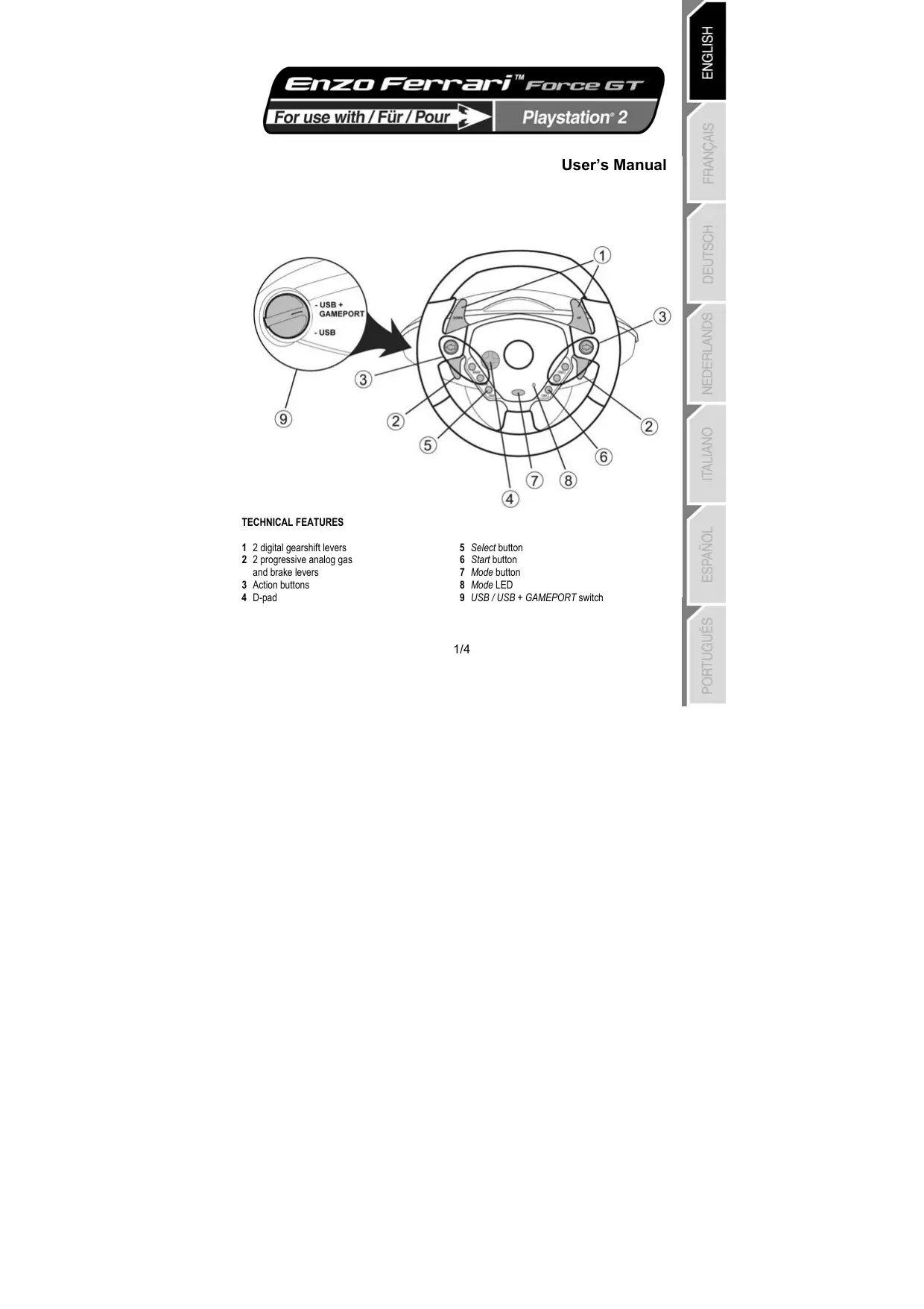 Cette position est à sélectionner pour les jeux qui ne nécessitent pas de connecter une manette en plus du volant USB. Cependant, nous vous conseillons, afin d’éviter toute manipulation, de brancher sur votre console le connecteur GAMEPORT en plus du connecteur USB de votre volant. La plupart des jeux récents utiliseront cette position. Commutateur en position « USB/GAMEPORT » Cette position est à sélectionner pour les jeux qui nécessitent de connecter une manette en plus du volant USB (la manette vous permettant d’accéder aux options de configuration pour faire reconnaître votre volant Force Feedback par le jeu). Avec le volant ENZO, il suffit de connecter à la fois les connecteurs USB et GAMEPORT pour remplacer cette manette. 4. Rallumez votre console. Le volant va s’autocalibrer de manière autonome. (Cette opération entraîne des mouvements du volant.) et le voyant lumineux (8) s’allume en rouge pour indiquer que le mode Retour de force est activé. 5. Dans les options de réglage du contrôleur de votre jeu, identifiez le Enzo en tant que volant Force Feedback (Retour de force). Vous êtes maintenant prêt à jouer ! B - pour jouer à un jeu de course type Moto, Quad ou autre véhicule avec votre volant Enzo émulant une manette de jeu : 1. Éteignez votre console avant de brancher le volant. 2. Branchez le connecteur console GAMEPORT (15) sur le port 1 de votre console de jeu puis branchez le connecteur USB (16) sur le port USB supérieur sans vous préoccuper de la position du commutateur USB / USB + GAMEPORT (9). 3. Rallumez votre console. Lors du lancement du jeu, lorsque le logo Playstation 2 est affiché, déconnectez le connecteur USB (16) et reconnectez-le aussitôt. (USB RESET) 4. Le volant va s’autocalibrer de manière autonome. (Cette opération entraîne des mouvements du volant.) et le voyant lumineux (8) s’allume en rouge pour indiquer que le mode Retour de force est activé. 5. Dans ce type de jeu, le volant est reconnu en tant que manette. Vérifiez et modifiez si nécessaire sa configuration dans les options du contrôleur (direction sur stick analogique gauche et pédalier sur stick analogique droit). Remarque : dans ce type de jeux, il ne vous sera pas possible de désactiver le mode Retour de force, ni de profiter du mode « Precision Drive ». Vous êtes maintenant prêt à jouer !