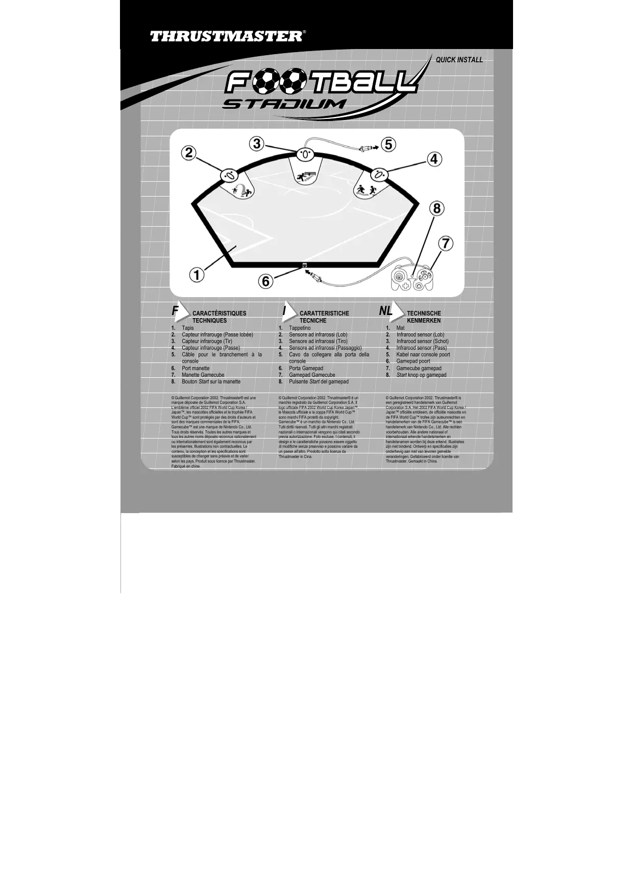 © Guillemot Corporation 2002. Thrustmaster® est une marque déposée de Guillemot Corporation S.A. L’emblème officiel 2002 FIFA World Cup Korea / Japan™, les mascottes officielles et le trophée FIFA World Cup™ sont protégés par des droits d’auteurs et sont des marques commerciales de la FIFA. Gamecube™ est une marque de Nintendo Co., Ltd. Tous droits réservés. Toutes les autres marques et tous les autres noms déposés reconnus nationalement ou internationalement sont également reconnus par les présentes. Illustrations non contractuelles. Le contenu, la conception et les spécifications sont susceptibles de changer sans préavis et de varier selon les pays. Produit sous licence par Thrustmaster. Fabriqué en chine.