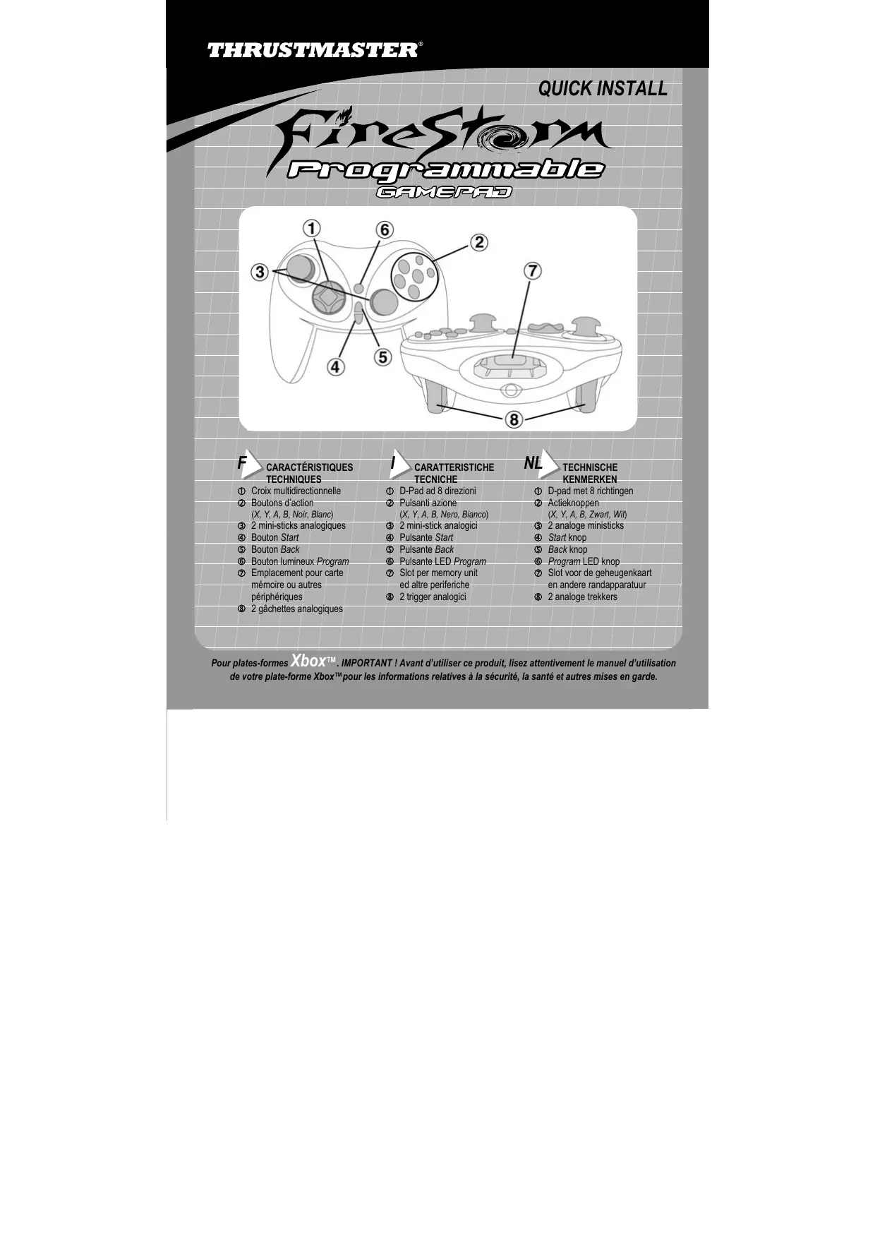 Maintenez le bouton lumineux Program enfoncé pendant plus de 3 secondes : le voyant s’allume en rouge, puis devient vert pendant 2 secondes. La configuration par défaut est restaurée. www.thrustmaster.com © Guillemot Corporation 2001. Thrustmaster® et FireStorm™ sont des marques et/ou des marques déposées de Guillemot Corporation S.A. Xbox™ est une marque de Microsoft Corporation aux États-Unis et/ou dans d’autres pays et est utilisée avec l’accord de Microsoft. Toutes les autres marques sont des marques et/ou des marques déposées de leurs propriétaires respectifs. Photos non contractuelles. Le contenu, la conception et les spécifications sont susceptibles de changer sans préavis et de varier selon les pays.