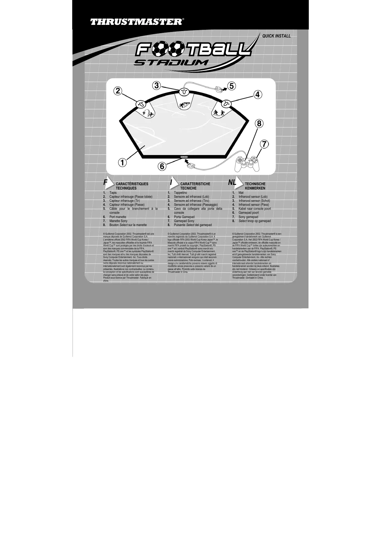 © Guillemot Corporation 2002. Thrustmaster® est une marque déposée de Guillemot Corporation S.A. L’emblème officiel 2002 FIFA World Cup Korea / Japan™, les mascottes officielles et le trophée FIFA World Cup™ sont protégés par des droits d’auteurs et sont des marques commerciales de la FIFA. PlayStation®, PS one™ et les symboles PlayStation® sont des marques et/ou des marques déposées de Sony Computer Entertainment, Inc. Tous droits réservés. Toutes les autres marques et tous les autres noms déposés reconnus nationalement ou internationalement sont également reconnus par les présentes. Illustrations non contractuelles. Le contenu, la conception et les spécifications sont susceptibles de changer sans préavis et de varier selon les pays. Produit sous licence par Thrustmaster. Fabriqué en chine.
