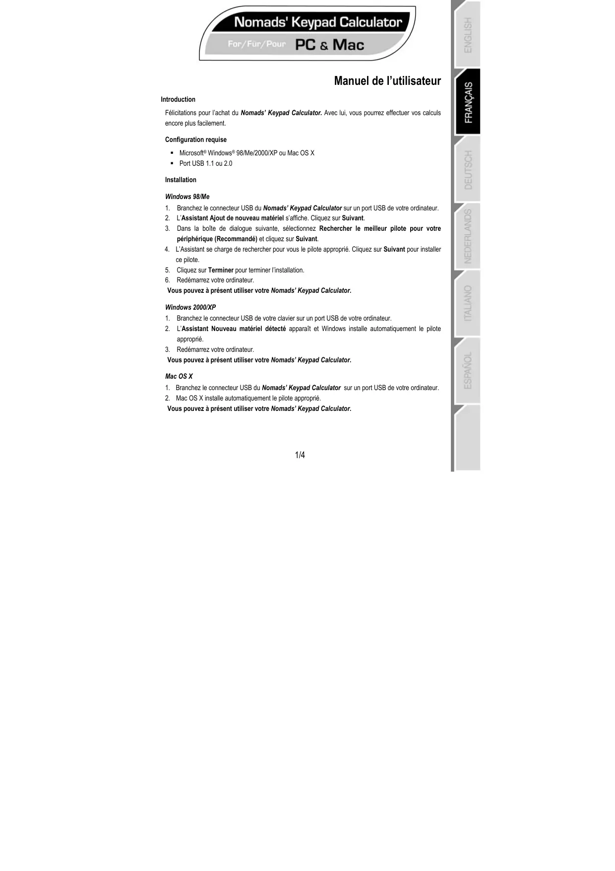 Introduction Félicitations pour l’achat du Nomads’ Keypad Calculator. Avec lui, vous pourrez effectuer vos calculs encore plus facilement. Configuration requise Microsoft® Windows® 98/Me/2000/XP ou Mac OS X Port USB 1.1 ou 2.0 Installation Windows 98/Me 1. Branchez le connecteur USB du Nomads’ Keypad Calculator sur un port USB de votre ordinateur. 2. L’Assistant Ajout de nouveau matériel s’affiche. Cliquez sur Suivant. 3. Dans la boîte de dialogue suivante, sélectionnez Rechercher le meilleur pilote pour votre périphérique (Recommandé) et cliquez sur Suivant. 4. L’Assistant se charge de rechercher pour vous le pilote approprié. Cliquez sur Suivant pour installer ce pilote. 5. Cliquez sur Terminer pour terminer l’installation. 6. Redémarrez votre ordinateur. Vous pouvez à présent utiliser votre Nomads’ Keypad Calculator. Windows 2000/XP 1. Branchez le connecteur USB de votre clavier sur un port USB de votre ordinateur. 2. L’Assistant Nouveau matériel détecté apparaît et Windows installe automatiquement le pilote approprié. 3. Redémarrez votre ordinateur. Vous pouvez à présent utiliser votre Nomads’ Keypad Calculator. Mac OS X 1. Branchez le connecteur USB du Nomads’ Keypad Calculator sur un port USB de votre ordinateur. 2. Mac OS X installe automatiquement le pilote approprié. Vous pouvez à présent utiliser votre Nomads’ Keypad Calculator.