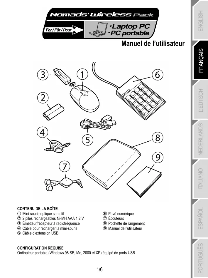 RECOMMANDATIONS Par mesure de sécurité, veuillez respecter les précautions suivantes : - N’ouvrez en aucun cas les accessoires de votre Nomads’ Wireless Pack, vous risqueriez d’endommager les composants internes. - Placez votre Nomads’ Wireless Pack sur une surface plane pour éviter tout risque de chute. - Évitez de tirer ou de tordre le(s) câble(s). - Ne rechargez en aucun cas votre mini-souris avec un câble de recharge autre que celui qui se trouve dans votre Nomads’ Wireless Pack. - Inutile de retirer les piles lorsque vous n’utilisez pas la mini-souris. Cette dernière est en effet dotée d’un système d’économie des piles. - Débranchez votre Nomads’ Wireless Pack et retirez les piles de la mini-souris avant tout nettoyage. Utilisez un chiffon humecté et évitez l’usage d’aérosols.