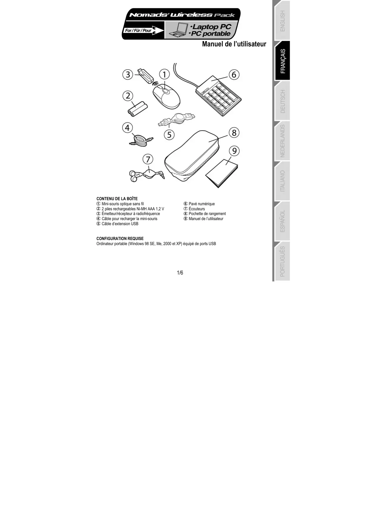 CONFIGURATION REQUISE Ordinateur portable (Windows 98 SE, Me, 2000 et XP) équipé de ports USB