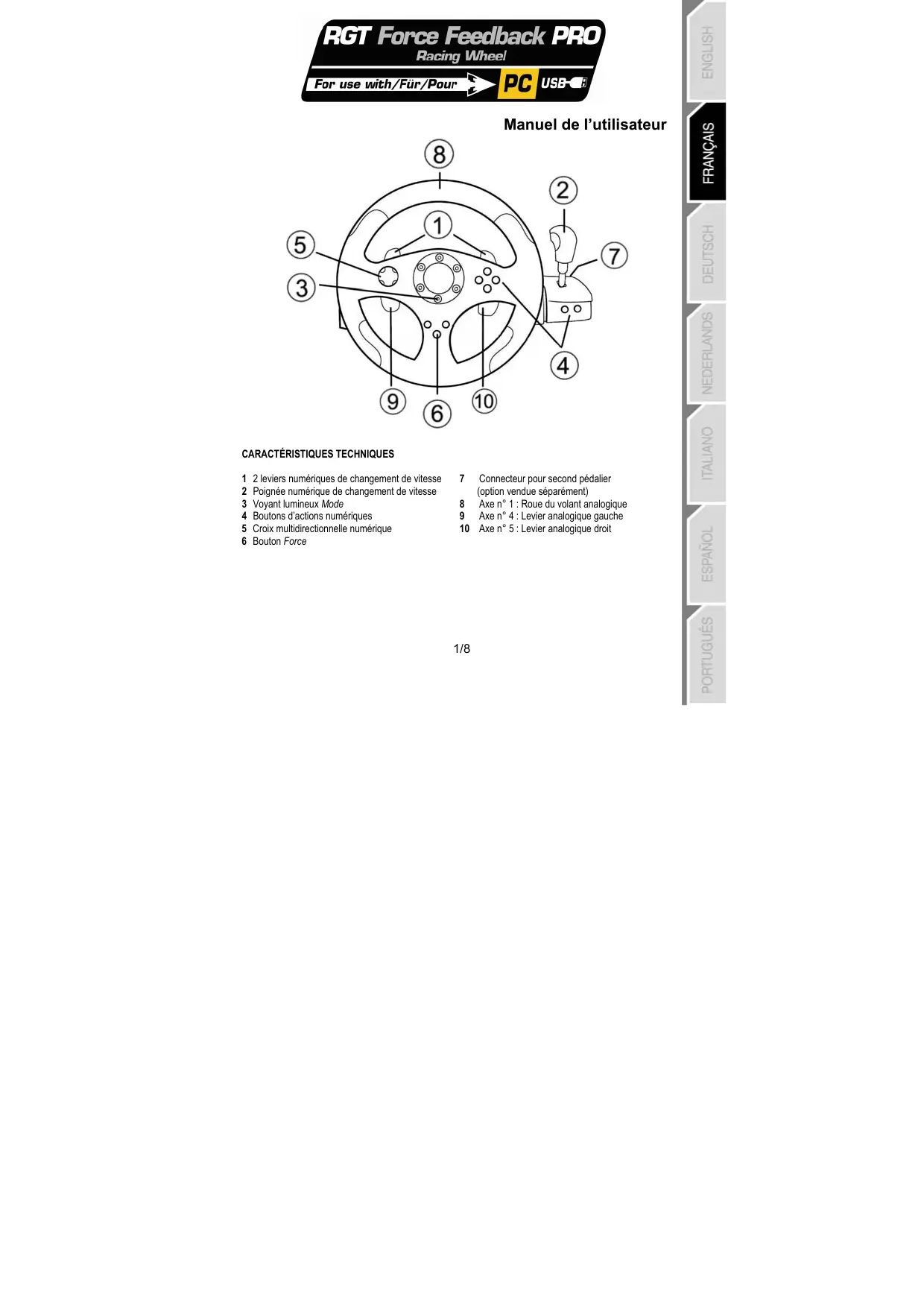 Connecteur pour second pédalier (option vendue séparément) 8 Axe n° 1 : Roue du volant analogique 9 Axe n° 4 : Levier analogique gauche 10 Axe n° 5 : Levier analogique droit 1/8