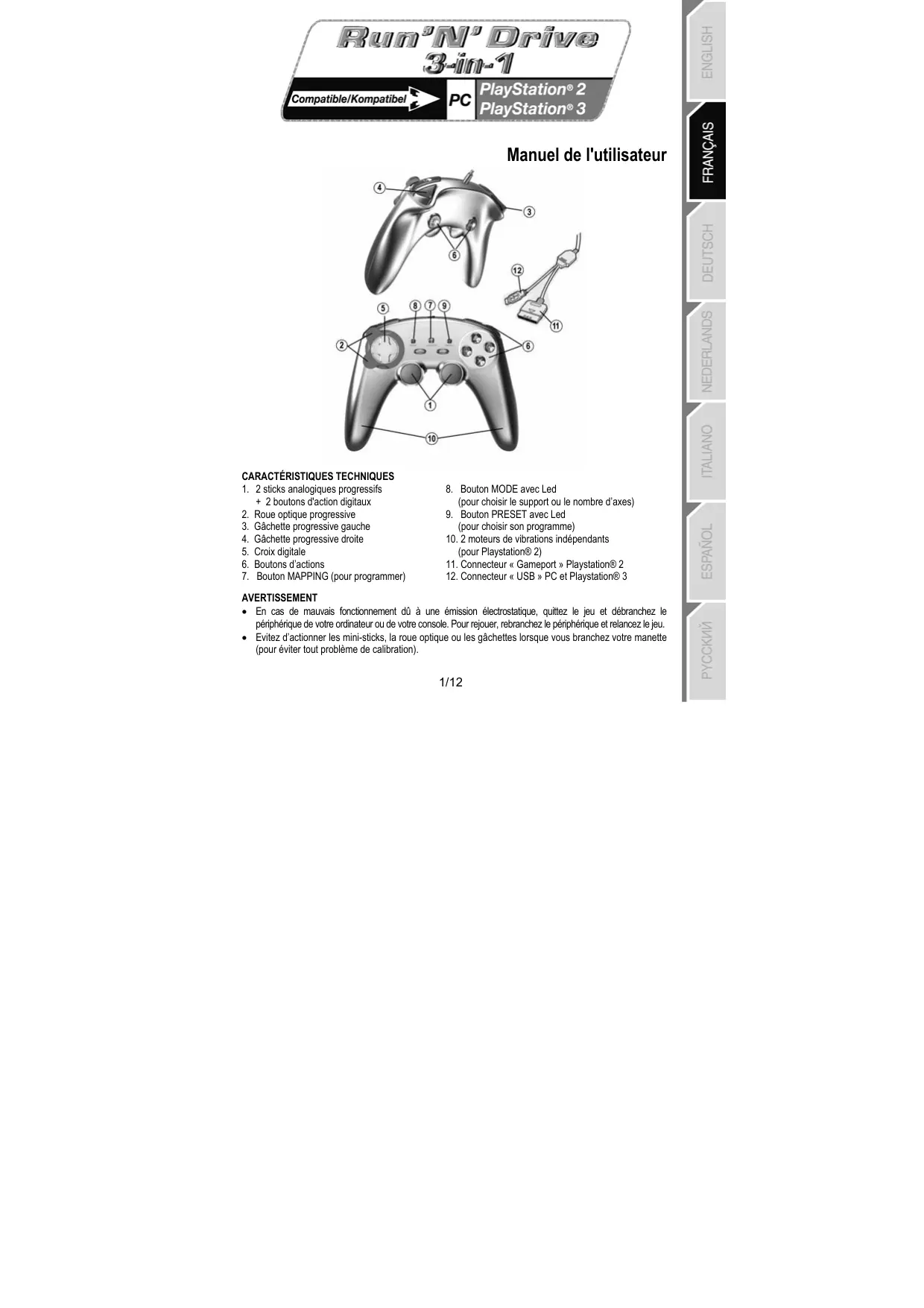 (pour choisir le support ou le nombre d’axes) 9. Bouton PRESET avec Led (pour choisir son programme) 10. 2 moteurs de vibrations indépendants (pour Playstation® 2) 11. Connecteur « Gameport » Playstation® 2 12. Connecteur « USB » PC et Playstation® 3