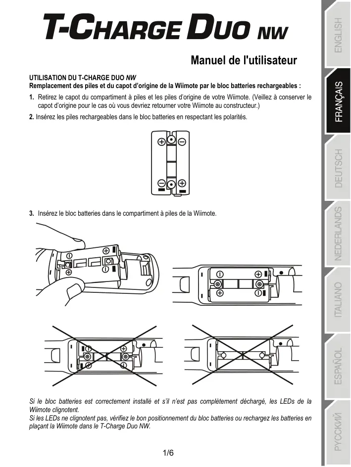 Manuel de l'utilisateur UTILISATION DU T-CHARGE DUO NW Remplacement des piles et du capot d’origine de la Wiimote par le bloc batteries rechargeables : 1. Retirez le capot du compartiment à piles et les piles d’origine de votre Wiimote. (Veillez à conserver le capot d’origine pour le cas où vous devriez retourner votre Wiimote au constructeur.) 2. Insérez les piles rechargeables dans le bloc batteries en respectant les polarités.