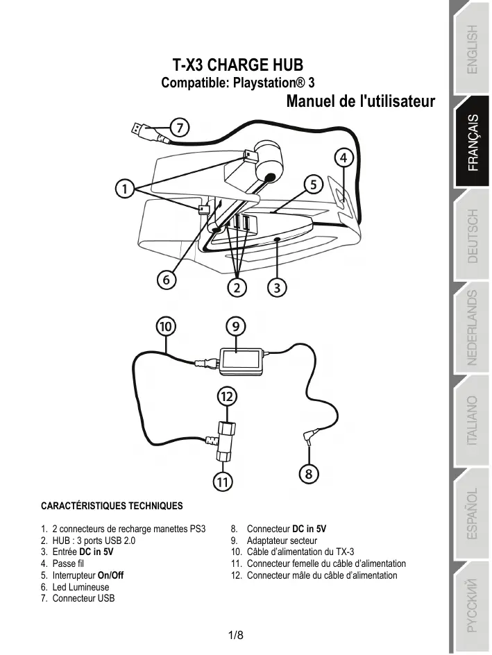 Le « T-X3 CHARGE HUB » est le 1er accessoire PlayStation® 3 à vous permettre : - de recharger 2 manettes SIXAXIS™ ou DUALSHOCK®3 même lorsque la console est éteinte. - d’ajouter 3 ports USB 2.0 alimentés à votre console. Le TX-3 s’alimente directement à l’arrière de la console et est ainsi compatible dans tous les pays, pour tous les types d’alimentation (de 100 à 240 V.), et sur tous les modèles de PlayStation® 3. Le Hub USB qui est Hi-Speed et alimenté, vous garantit une compatibilité à 100% avec l’ensemble des accessoires pouvant se connecter à une PlayStation® 3 : PSP™, guitares, webcams, micros, guns, clés USB, joysticks, manettes, volants, etc…