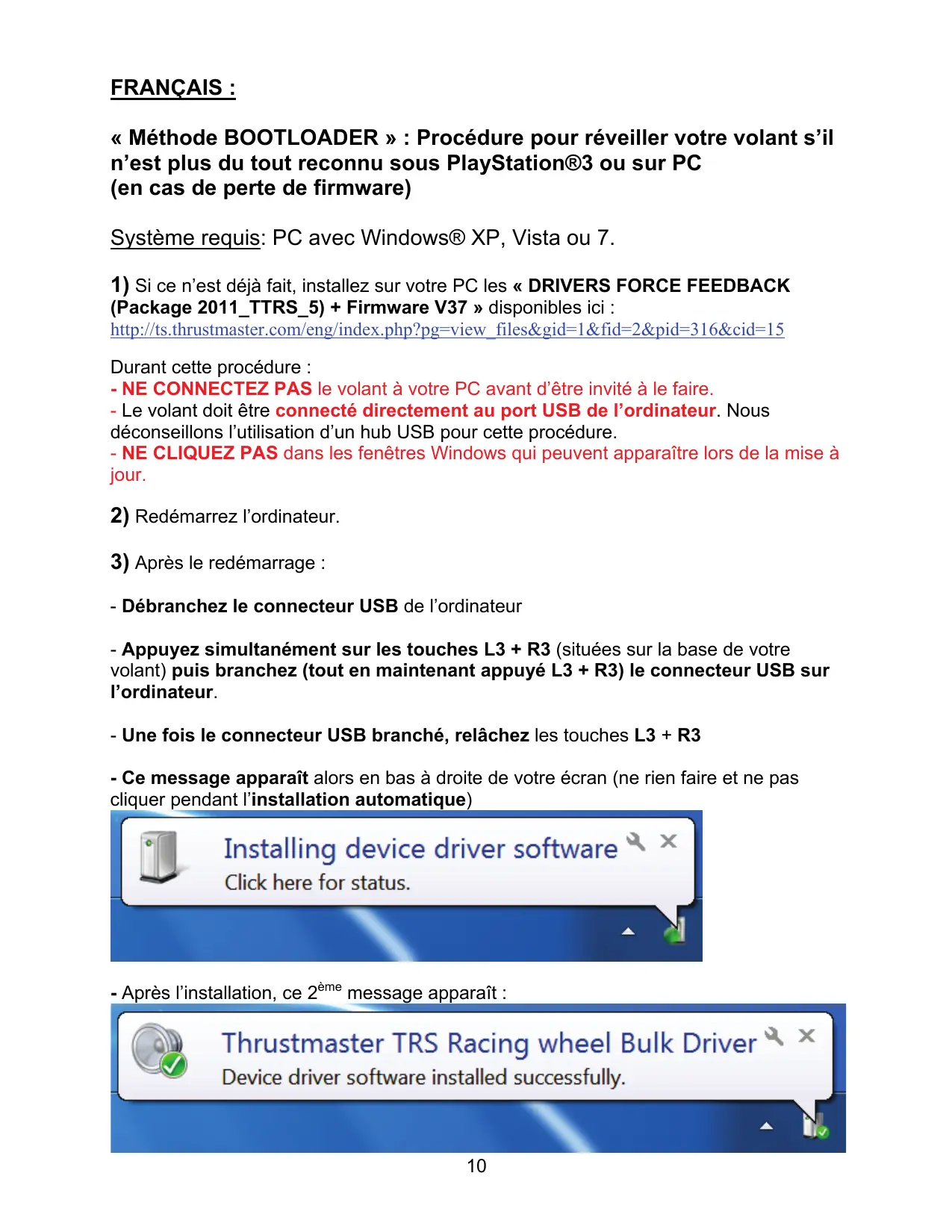 (Package 2011_TTRS_5) + Firmware V37 » disponibles ici : http://ts.thrustmaster.com/eng/index.php?pg=view_files&gid=1&fid=2&pid=316&cid=15 Durant cette procédure : - NE CONNECTEZ PAS le volant à votre PC avant d’être invité à le faire. - Le volant doit être connecté directement au port USB de l’ordinateur. Nous déconseillons l’utilisation d’un hub USB pour cette procédure. - NE CLIQUEZ PAS dans les fenêtres Windows qui peuvent apparaître lors de la mise à jour.